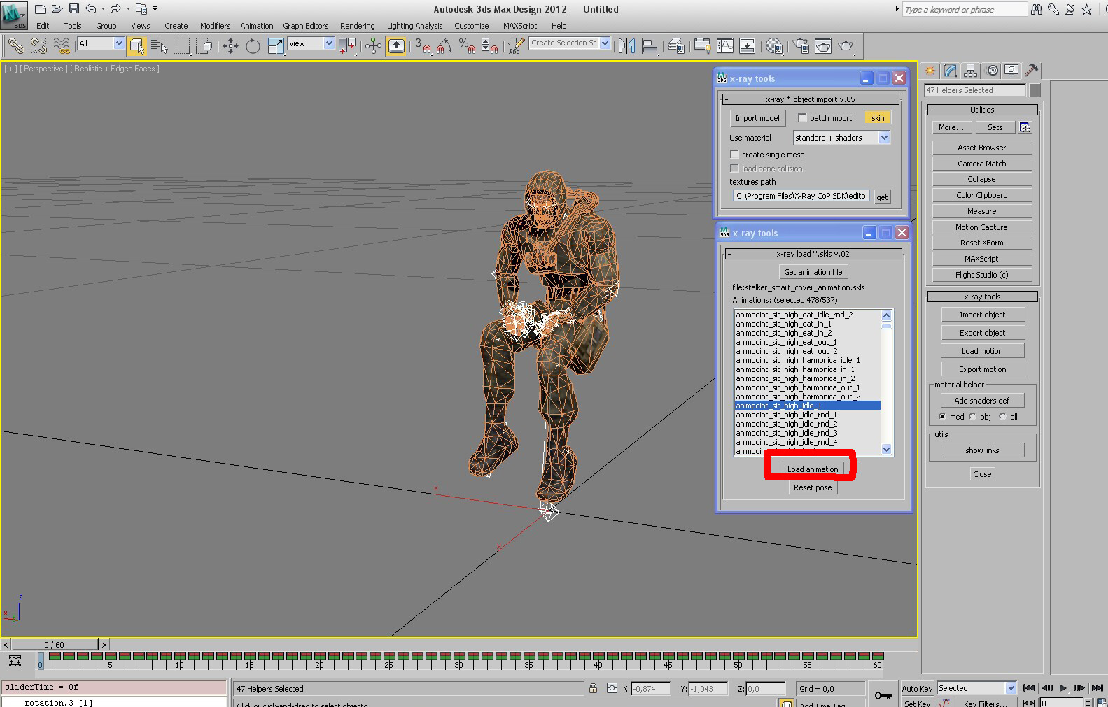 - Wszystkie kości zostały wybrane - można wczytywać samą animację. Wybieramy ją z listy i naciskamy Load animation: