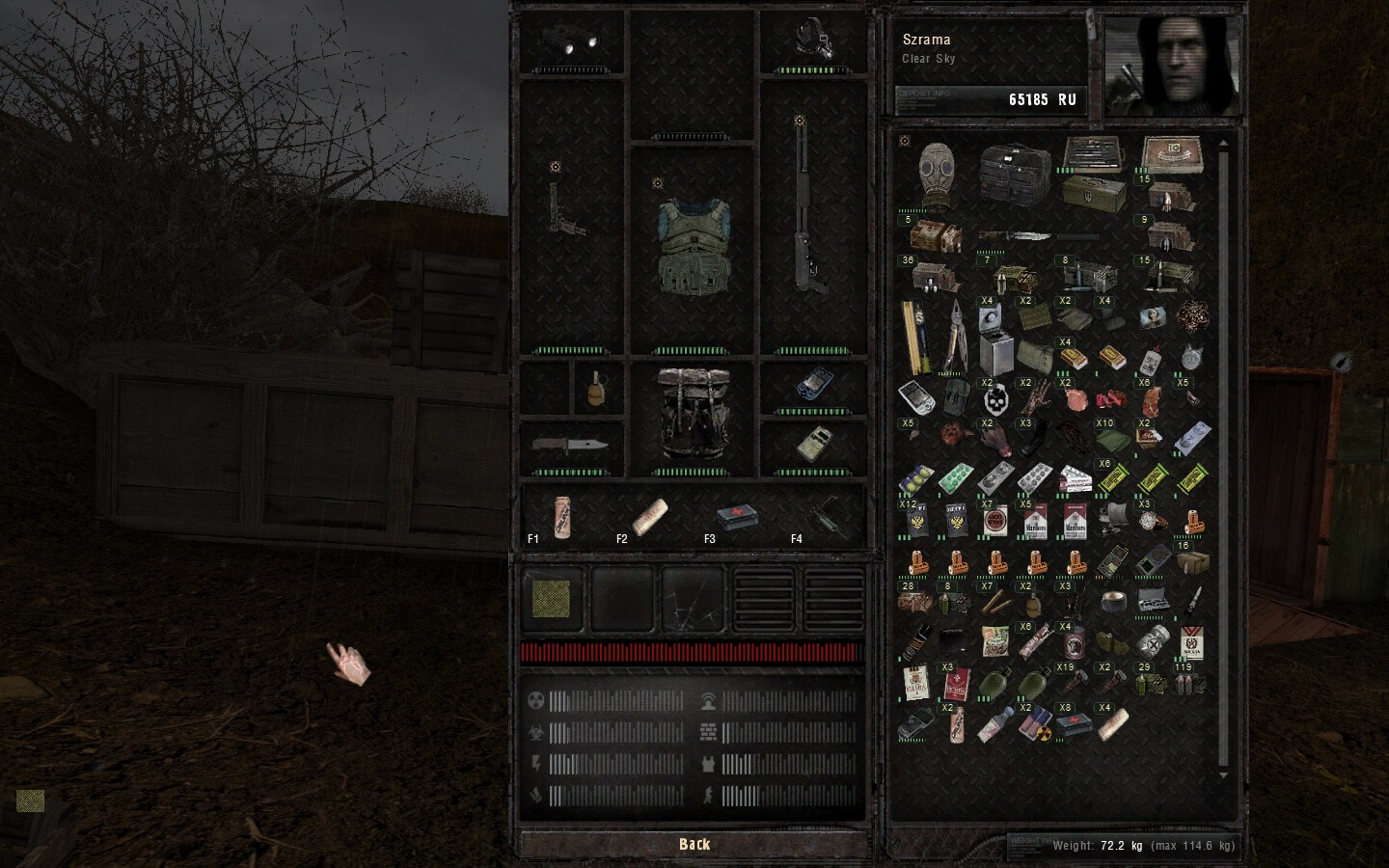 Pamiętać - rozkładać popsute bronie na części i zanosić do mechaników, mięso i skóry do Rzeźnika na Wysypisku (który ma też najtańszy śrut, tylko chyba on się nie odnawia u mnie) a arty do naukowców albo czekać aż dostaniemy zadanie na nie. Są jakieś nowe arty ale większość nie ma żadnego efektu, może jak poszperam w anomaliach jeszcze to coś się zmieni. A i po apteczki tylko do medyków (Powinność dostała nowego co kisi się w wagonie naprzeciw bramy).