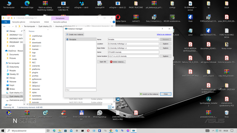W każdym razie nie działa bo masz wszystko źle ustawione. Tą instancję STALKER ANOMALY usuń, kliknij na Przenośna i w niej zmień ścieżki w “Lokacja”, “Folder bazowy” i “Lokalizacja gry” - w pierwszych dwóch wskazujesz ten sam folder (nie konkretne pliki) - czyli folder, w którym masz Anthology, a w ostatnim ten, w którym masz czyste Anomaly. Ja mam u siebie ustawione tak jak na zrzucie w spoilerze i u mnie śmiga.