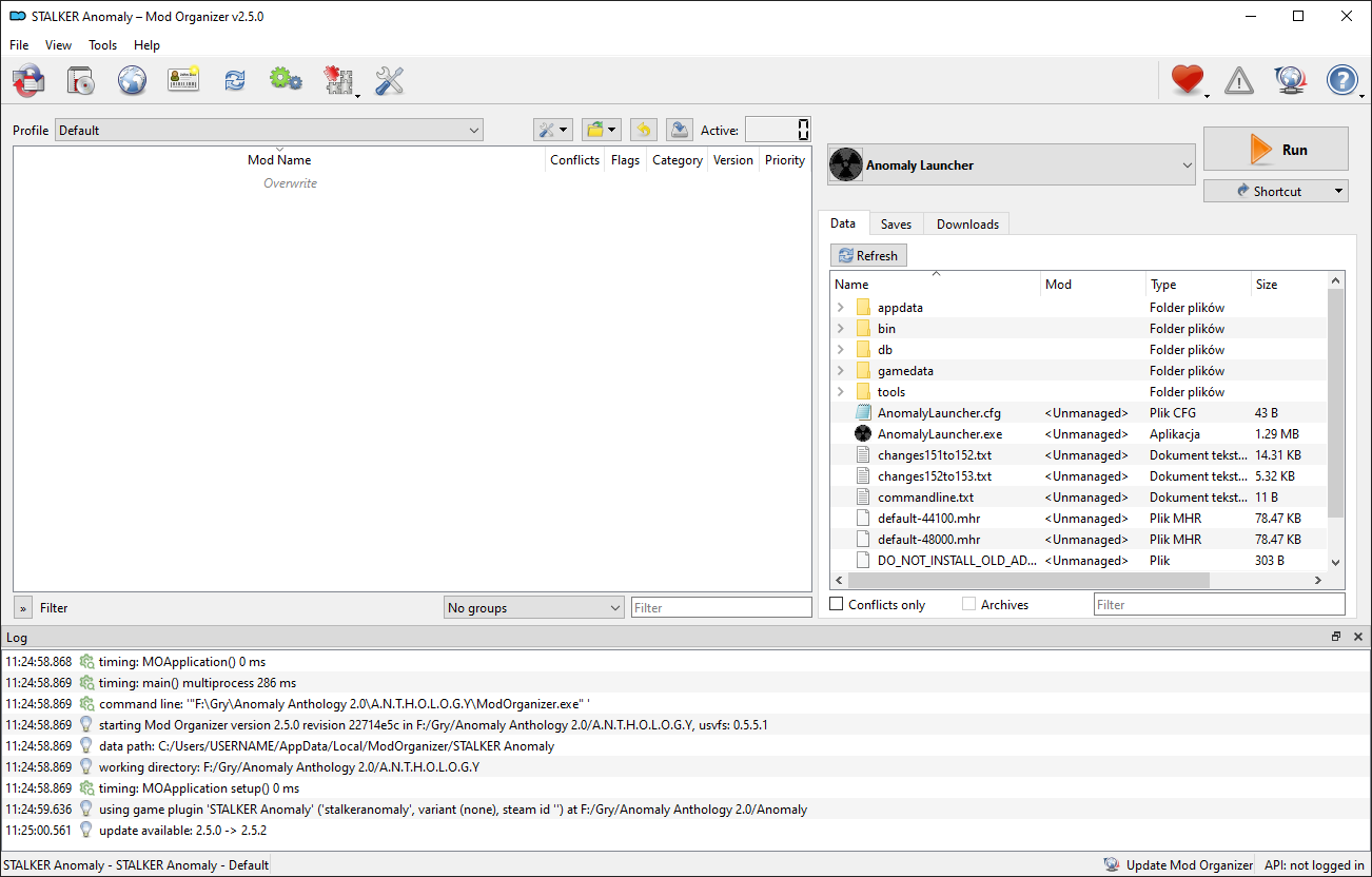 Grę odpalam przez Mod Organizer w zainstalowanym AA 2.0, tam edytowałem ścieżki do każdej pozycji Anomaly (DX11) itd., gra odpala, ale z jakiegoś powodu lista modów nie wczytuje mi się i nie mogę aktywować spolszczenia.
