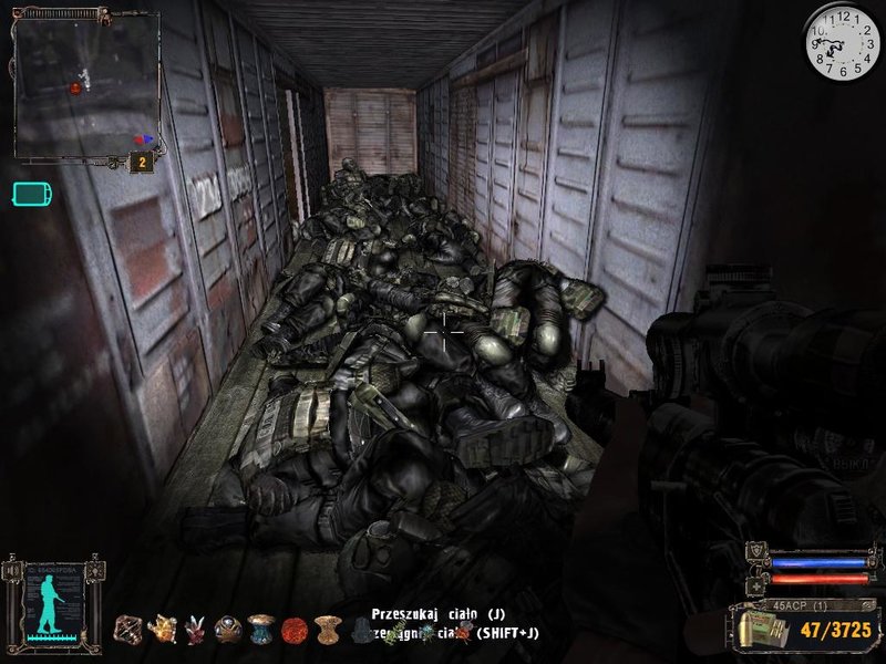 @kazik - Tego gameplaya nie widziałem, ale i bez niego trafiłem we wszystkie właściwe miejsca. Ten mój screen z opcją spania, jest zrobiony dokładnie w tym samym miejscu jaki w krzaku pokazuje gameplayer. Gdyby to był tylko błędny opis, powinno mi schowek otworzyć. A ja dostaję informację, że nie mogę spać ze względu na napromieniowanie, choć nie jestem. Wejdę jeszcze raz na Agroprom i zobaczę co z tego wyjdzie. Bo w czystą Apokalipsę grać mi się nie chce.