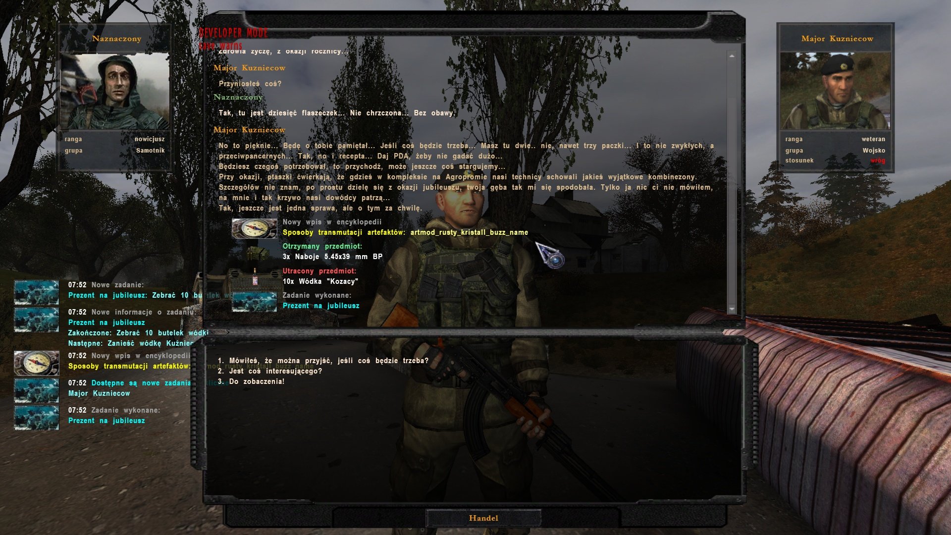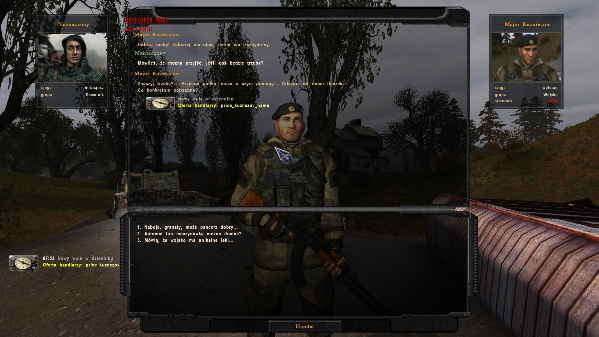 Co do tego, że powinny być “ściany” a nie “mafia” pełna zgoda. Natomiast nie udało mi się tej zmiany wyegzekwować u przyjaciół moskali. Wywiązała sie z tego nawet zabawna dyskusja, ale wybaczcie, nie chce mi się tego tłumaczyć. Posunąłem się nawet do tego, że na własną rękę podmieniłem w tekście tę mafię na ściany, co zaraz zostało wychwycone i zostałem poinformowany “Кшиштоф… Проверь в dialogs_amk.xml, перевод для koloda_krest_61 и koloda_krest_62. У тебя там стены и мафия поменяны местами…” no i po sprawie…