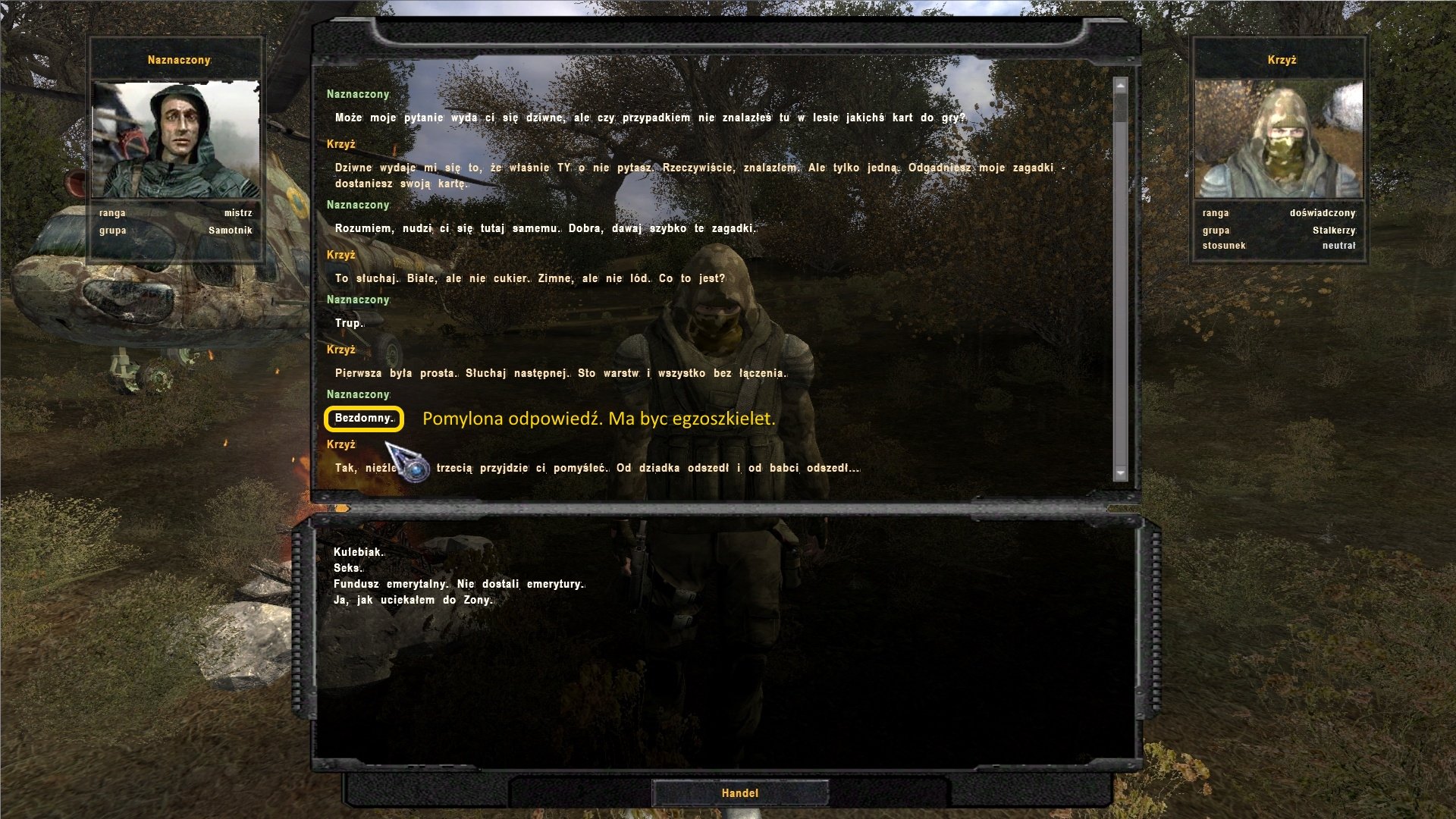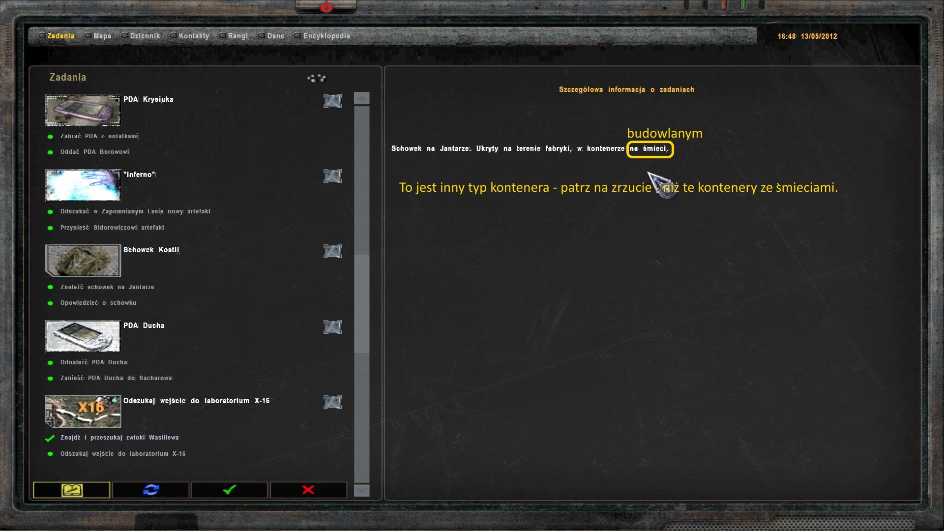 Odnośnie opisu schowka Kostii na Jantarze. Na twoim screenie nic nie widać, natomiast opis tego schowka funkcjonuje w takiej postaci od czasów NS, przez OOP, OP-2 do NS2016. Jak pamiętam, to był kontener na śmieci. Zresztą, tak jest w rosyjskim tekście. Na razie, żadnych zmian, do czasu przedstawienia poważniejszych dowodów winy