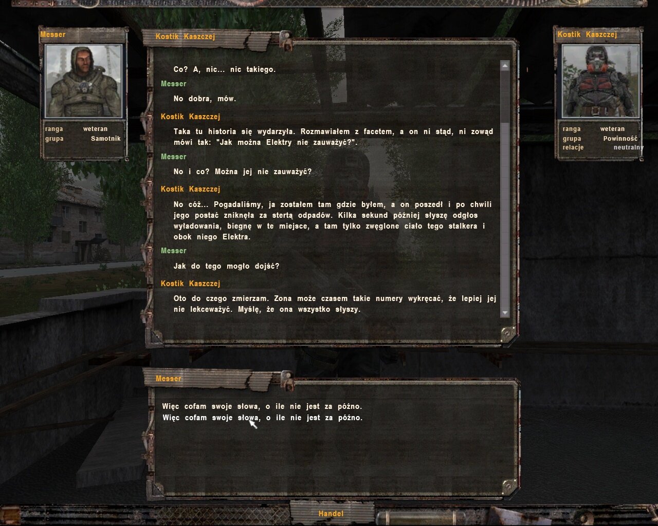 Natrafiłem w grze na zdublowaną odpowiedź, ale w przetłumaczonym pliku jest to tylko raz wykazane. Wg mnie, na drugim miejscu powinno być “Cholera, miał chłopina pecha.”, bo tak jest w pliku. Podam tę sekwencję, jest to w gamedata/configs/text/pol/stable_dialogs_escape - linia 807 i linia 810. Coś skrypt nie zakaczał, czy co? Da się to naprawić? Jeśli to tylko u mnie, to spoko.