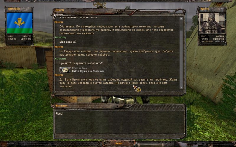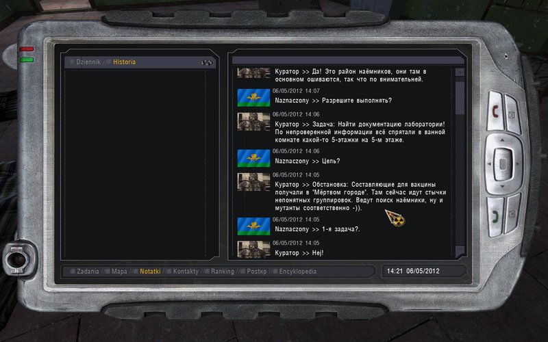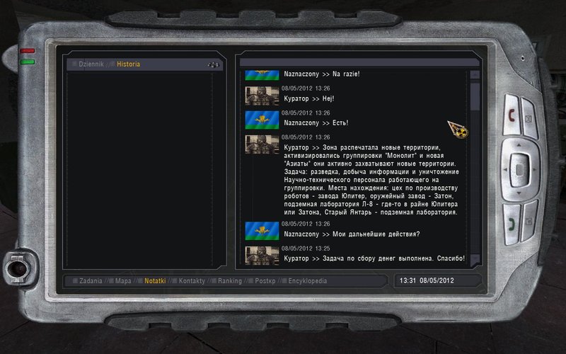 Po przebrnięciu 4 drzwi kodowych, stad mutantów, nasz upór zostaje nagrodzony - wystarczy się wydostać :o. Posuwamy się do góry - doprowadzi nas to do przejścia na Jantar. Tam spotykamy Kuratora. Po dokumenty tym razem wybieramy się na Radar. Zgodnie ze wskazówkami, szukamy w koszarach.