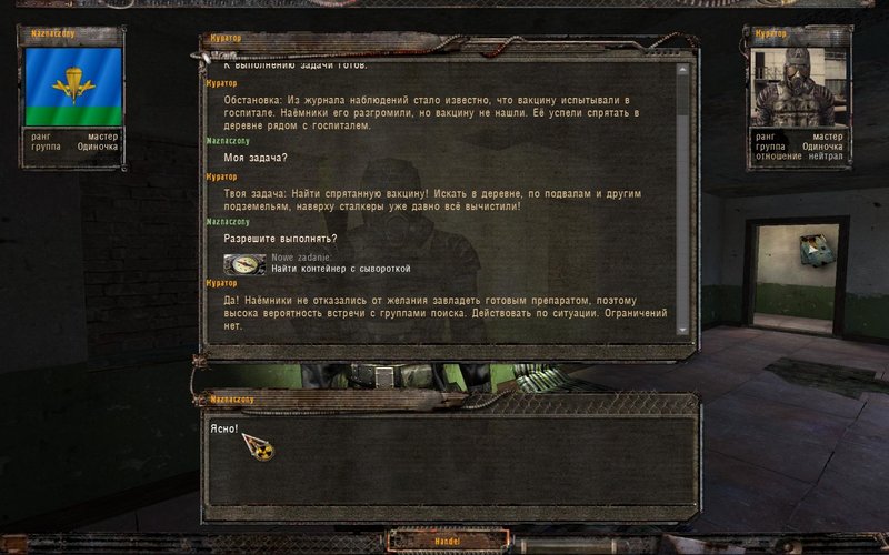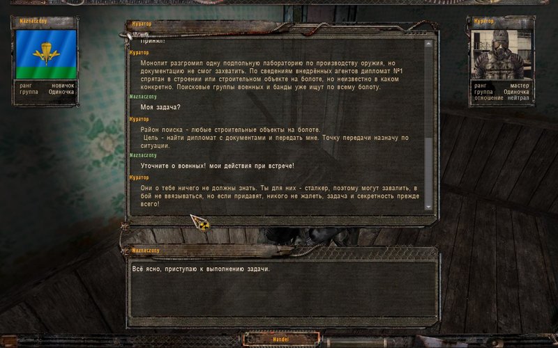 Początek gry jest taki jak w podstawowej wersji. Zmiany, zauważymy już podzczas szturmu na ATP, gdzie do akcji przyłącza się Wojsko. Sprzęt i uzbrojenie jest niesamowite i śmiertelnie niebezpieczne. Pełen realizm. Po wybiciu bandytów i Wojskowych, “czyścimy” niedobitki w okolicy (mogą zabić naszego przyszłego pracodawcą) i wracamy do Wioski Kotów. Tam w pierwszym domu po prawej spotykamy Kuratora. Stajemy się agentem rządu, (kod 027) nasze zadanie zebrać dokumentację projektu, na który składją się trzy dyplomatki - to pierwszy etap naszej długiej drogi. Wojskowi nie znając naszej tożsamości są nam wrodzy. Pierwszą teczkę mamy znaleźć na Bagnach w jednym z kompleksów budynków.