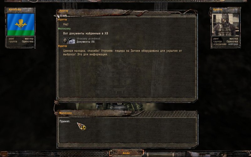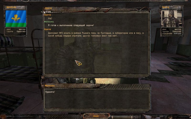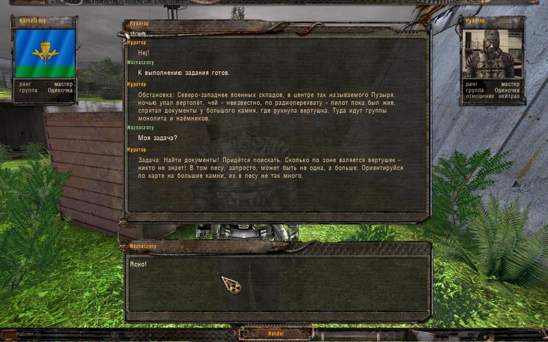 Spawn może nastąpić w siedmiu różnych miejscach - można się nabiegać. Po odnalezieniu jej dostajemy wiadomość SMS, że pracodawca będzie czekał w bazie Czystego Nieba. Kiedy odnajdujemy dokumenty, na Bagno napadają bandyci, chcąc pozbawić nas łupu. Odnajdujemy Przewodnika, który zabiera nas do celu.