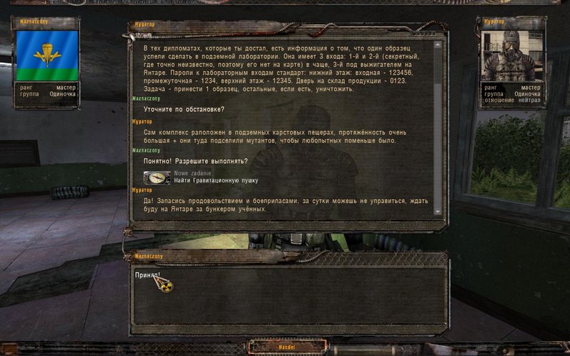 Po odnalezieniu dyplomatki nr2 dostajemy wiadomość, że nasz przełożony jest na Magazynach Wojskowych w bazie Wolnośćci. Czas ruszć. Spotykamu Kuratora - daje nam namiar na 3 część dokumentów. Czerwony Las, jakinia.