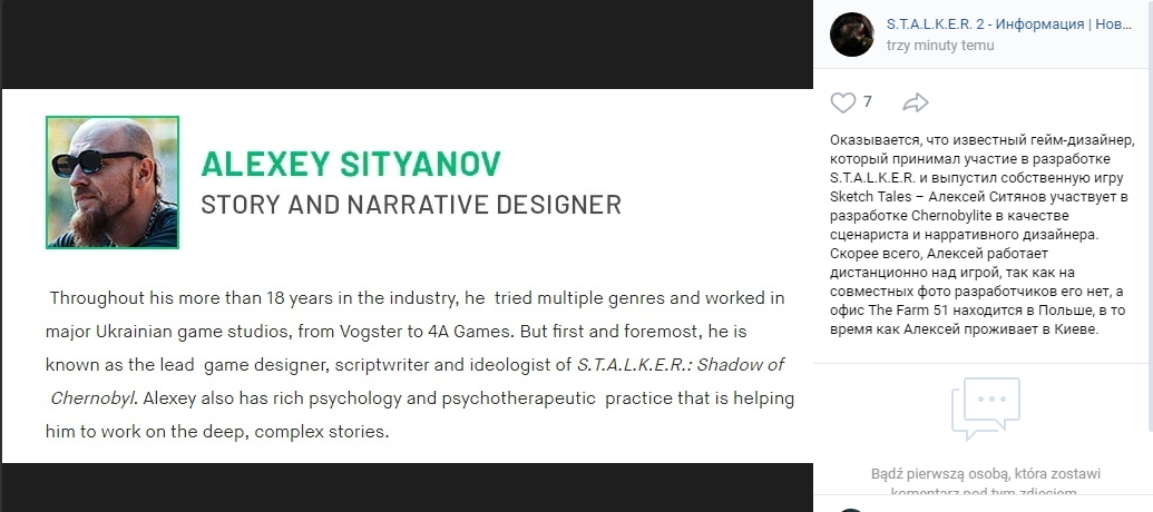 Dla nieobeznanych: okazuje się, że projektant biorący udział w rozwoju Stalkera (…) uczestniczy w pracach nad Chernobylite jako scenarzysta.