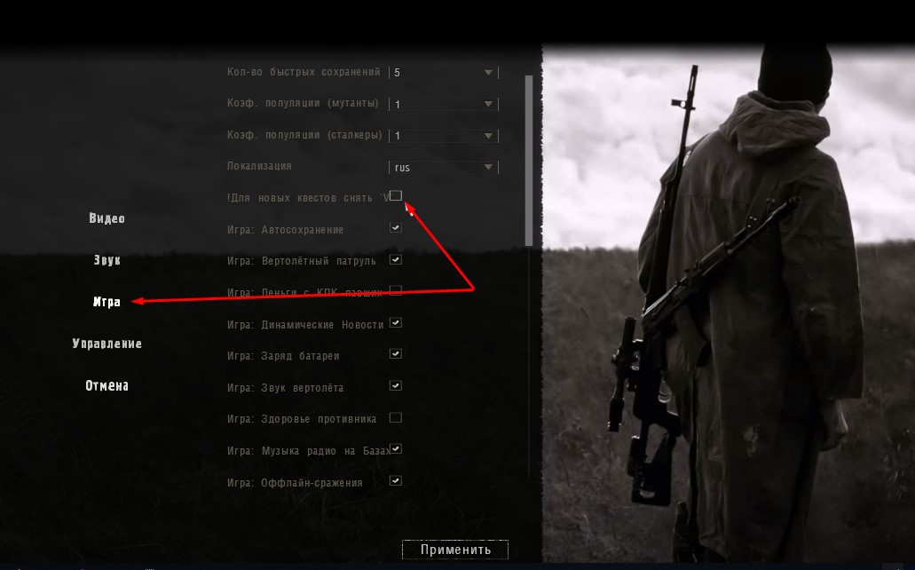 - Przed startem nowej gry: W głównym menu przechodzimy do zakładki Opcje, klikamy na punkt Gra, znajdujemy linijkę !Dla nowych zadań i odhaczamy. Zaczynając nową grę z fabułą “Ostatni żywy” przywracamy fajeczkę.