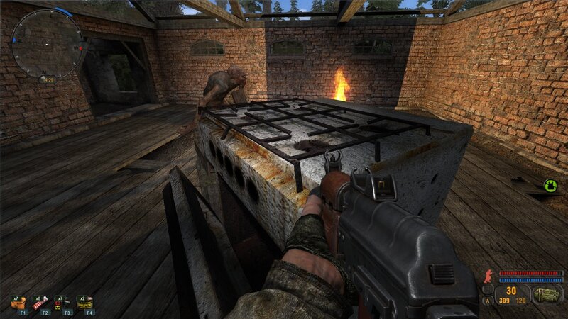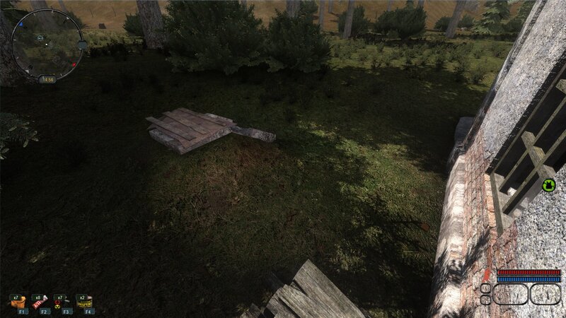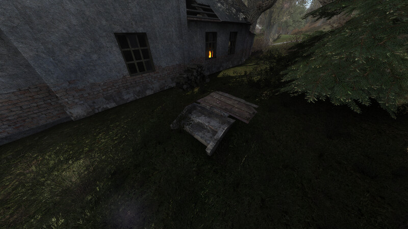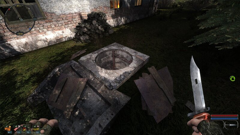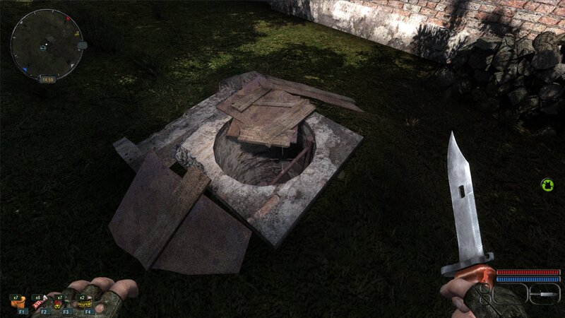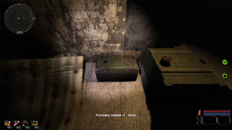Stajemy przy nim jak na 2. zrzucie i uderzamy bagnetem. Pozostałe na włazie fragmenty usuwamy przechodząc po nich. Po uzyskaniu “czystego” wejścia, schodzimy do ukrycia. Tam mamy kilka konserw i skrzynię z karabinem.