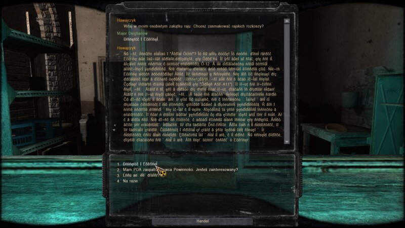 witam wszystkich serdecznie gram w tego moda i bardzo mi się podoba ale mam jeden problem - nie wszystkie dialogi są czytelne te z moda są w formie krzaczków czytelne są tylko dialogi z podstawki zew Prypeci pozwolę sobie dodać zrzut ekranu z problemem . było by miło gdyby znalazło się rozwiązanie tego problemu no i nie tylko dialogi bo zadania w pda też są nie czytelne . Z góry dziękuje za rozwiązanie tego problemu