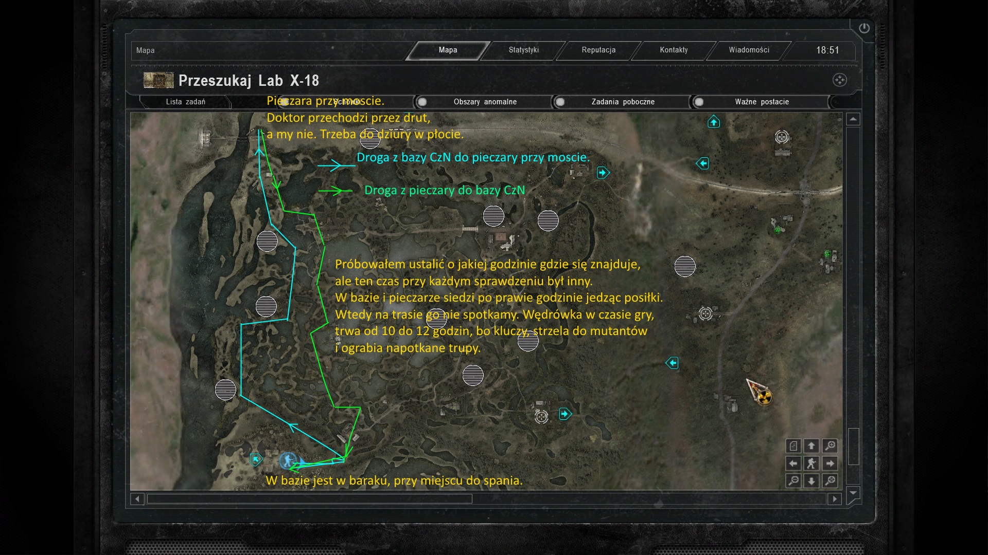Ale ja z czym innym. Natrafiłem w końcu na Doktora. To prawdziwe szukanie igły w stogu siana. Nie wiedząc o nim, niewielu zrobi to zadania. A widzę, że należałoby spotkać się z nim na początku, idąc na Bagna z Kordonu ( jak tam zaczynamy ), albo szybko tam zajść. Po to, aby powtórnie nie włazić tam, gdzie już byliśmy. Zadałem sobie trud i powtórzyłem grę, bez rozmowy z doktorkiem, aby prześledzić trasę jego wędrówek. Efektem jest załączony screen. Ze względu na niemożność ustalenia gdzie, o jakiej godzinie Doktor przebywa i tak spotkanie z nim nie będzie łatwe.