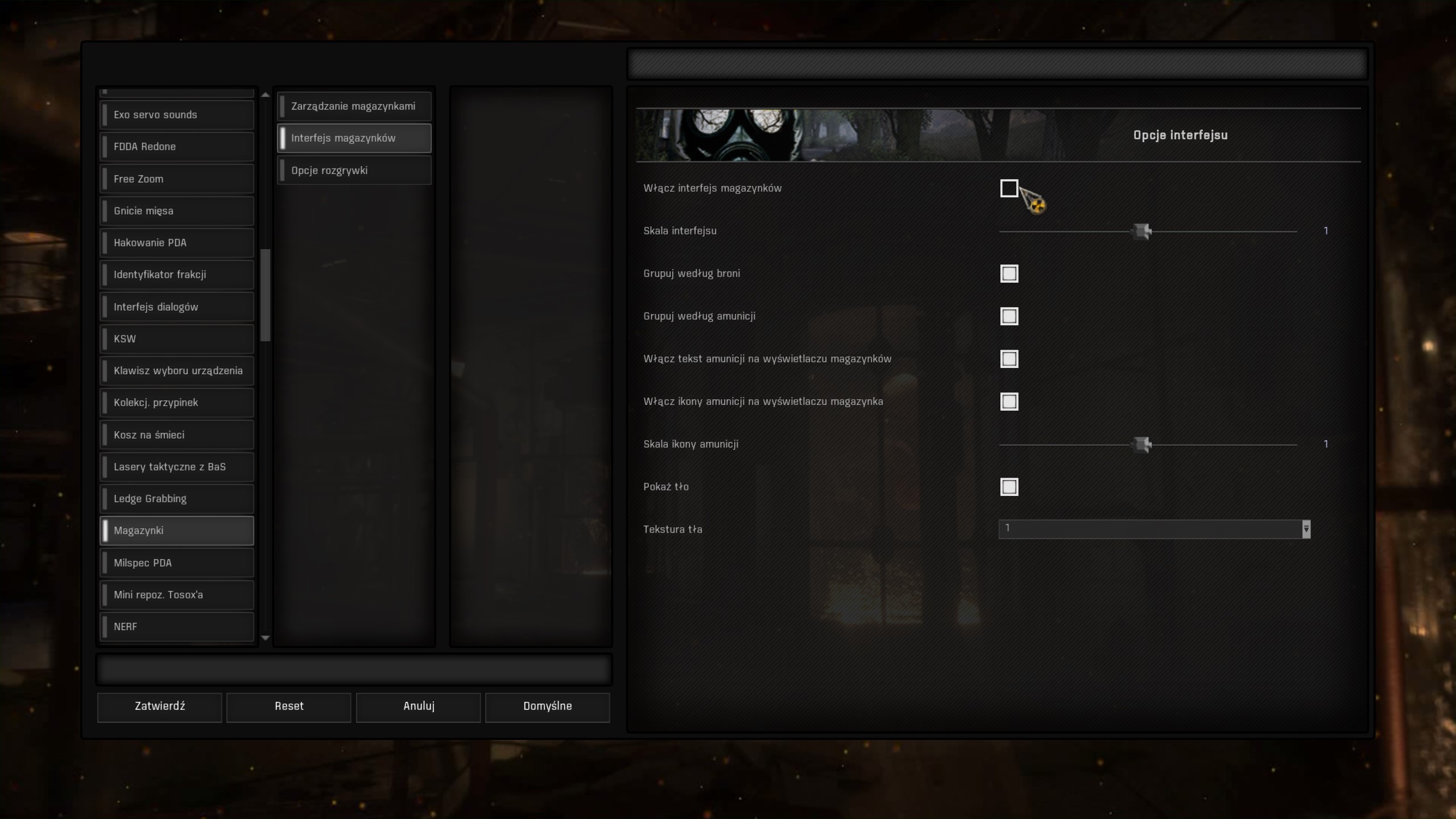 Spolszczenie przenosimy do kategorii UI. Następnie aktywujemy je, oraz wyłączamy mod ANUS_Revised_V3 (jedyne co robi ten mod to dodanie nowych imion i nazwisk dla naszej postaci jeśli korzystamy z opcji “Losuj” przy jej tworzeniu - nie tłumaczyłem go bo za dużo z tym roboty, więc najlepiej go wyłączyć żeby nie losowało angielsko-brzmiących imion i nazwisk.