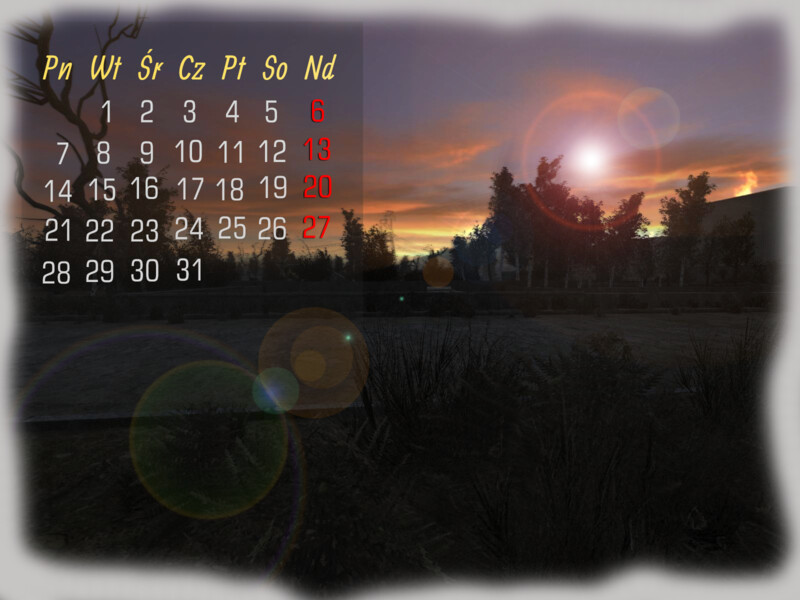 Ja również dodam coś od siebie, z góry proszę o wyrozumiałość, gdyż nigdy wcześniej kalendarzy nie robiłem, więc na pewno jest sporo miejsca do poprawy. Jako tło wykorzystałem jeden z klimatycznych screenshotów z Klimatyczne Screeny ze S.T.A.L.K.E.R.-a