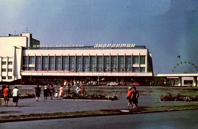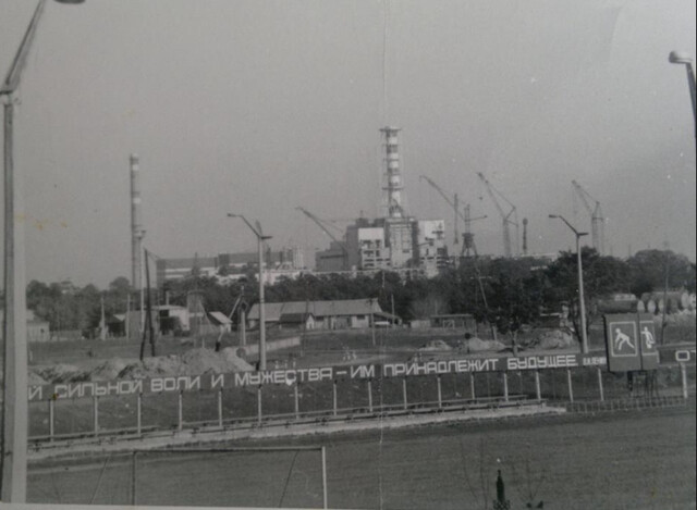 Widok na elektrownię ze stadionu klubu piłkarskiego Футбольный клуб «Строитель» Припять.