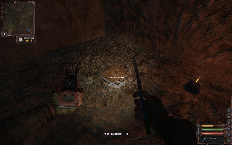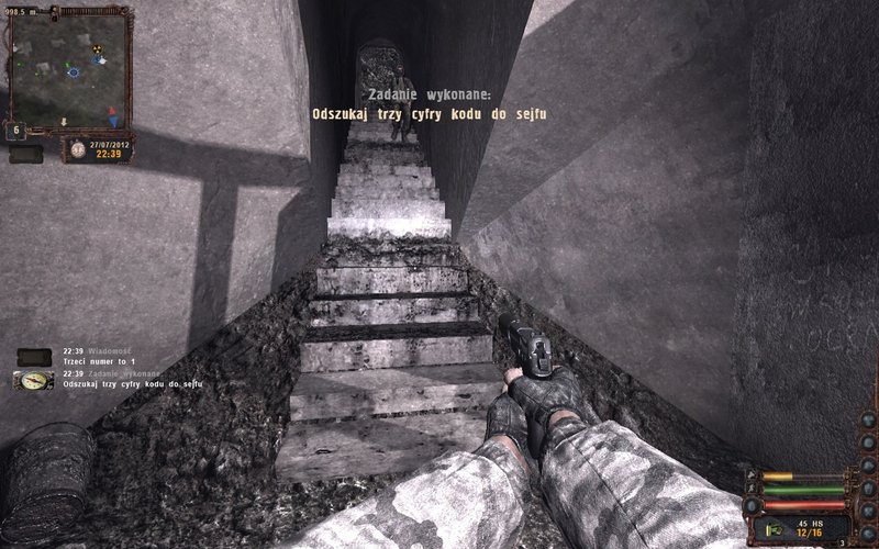 Dostajemy klucz od Pietrenki i zadanie - wykończyć pijawki w podziemiu. Ruszamy. Na miejscu, po wejściu do laboratorium znalazłem ciało i obok niego PDA z kodem do drzwi: 4526 - kod pasuje do dwóch kolejnych drzwi. Na biurku odnajdujemy dokumenty i PDA. Zabieramy. Kasujemy krwiopijców i wracamy do Wielesa. Po rozliczeniu zadania ten daje nam namiar na dwóch handlarzy w Martwym Mieście i w Prypeci - dostaniemy info na PDA jeżeli się pojawią - są krótko więc warto uważać na wiadomości. Wychodzimy z kopalni konkretnym wejściem by zadanie się zaliczyło - tym na most kolejowy.