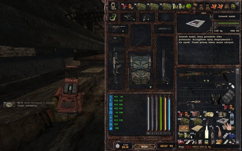 Wracamy do Wielesa i rozliczamy się. Bierzemy zadanie na X-14 - dokumenty. Przy okazji skorzystałem z podpowiedzi Apg2312i odnalazłem elitarny wykrywacz anomalii. Również podpowiedź Smoxa o schowku z bronią pod krzyżem była bezcenna ;D.