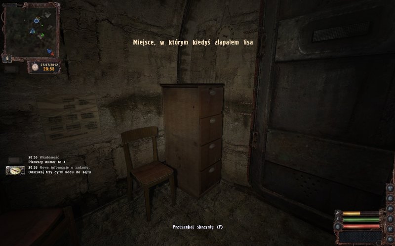 W drodze przez Wieś chwyta nas w szpony emisja - tracimy świadomość. Budzimy się w bunkrze naukowców - rozmawiamy z Deedee. Musimy odnaleźć wejście do podziemi na tamie we Wsi. Na Tamie wejście okazuje się zawalone. Tam tez można znaleźć narzędzia w skrzyniach drewnianych. Przychodzi SMS - mamy pomówić z Pustelnikiem. Ten wskazuje nam wejście lub zaprowadzi - jak kto woli. Po skończeniu dialogu zaczynamy rozmowę jeszcze raz - o legendarnym schowku. Pustelnik po wyjaśnieniach oddaje nam swoją część kodu - 59. Drugą ma jego były przyjaciel. Ten wstąpił do wojska i stacjonuje nieopodal. Idziemy na posterunek - trzymamy się drogi. Rozmawiamy z Sierżantem Nosaniem - uważnie czytamy dialogi - inaczej skończy się walką. Dostajemy drugą część kodu - 47 . Mamy całość: 5947. W X-18 były kodowe drzwi - może jeszcze jakieś napotkamy ;D. Teraz do podziemi po naukowca.