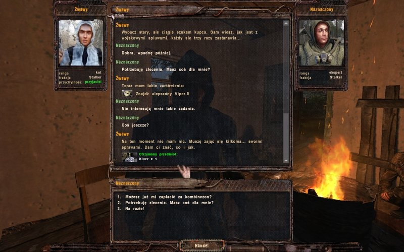 W Barze mówimy z Barmanem - kupujemy fleszkę - będzie potrzebna. Następnie mówimy z Pietrenką - mamy się spotkać z jego kontaktem, w Dolinie Mroku. Można też zrobić zadanie na karabin dla Łowcy - leży teraz na wersalce ;D. W DM mówimy z kontaktem - mamy zdobyć kurtkę bandyty i znaleźć naiwniaka od którego poznamy hasło do bazy Monolitu. Kurtka jest w podziemiach przy jednym z ciał - aby zadanie się zaliczyło nakładamy ja. Koło bazy bandytów znajdujemy nawalonego jak stodoła bandytę - od niego wyciągamy informację. Ruszamy dalej.