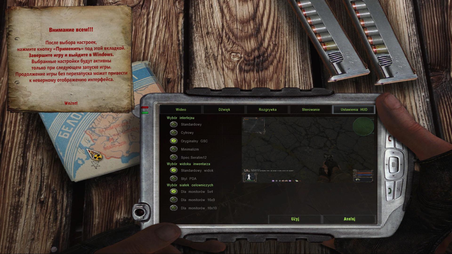 Już go uruchomiłem i jeden screen z ustawiania menu. To w lewym rogu, to ważna uwaga. “Ważne” jest po Polsku, ale informacja nie. Kto nie zna rus, nie pozna treści. Szukałem tego pliku z treścią, ale nie znalazłem. Jak będzie naprowadzienie, to go przerobię.