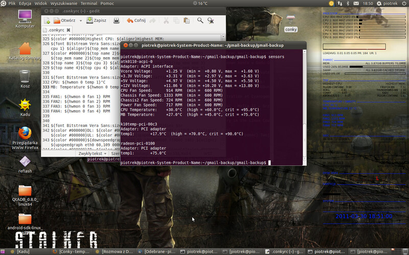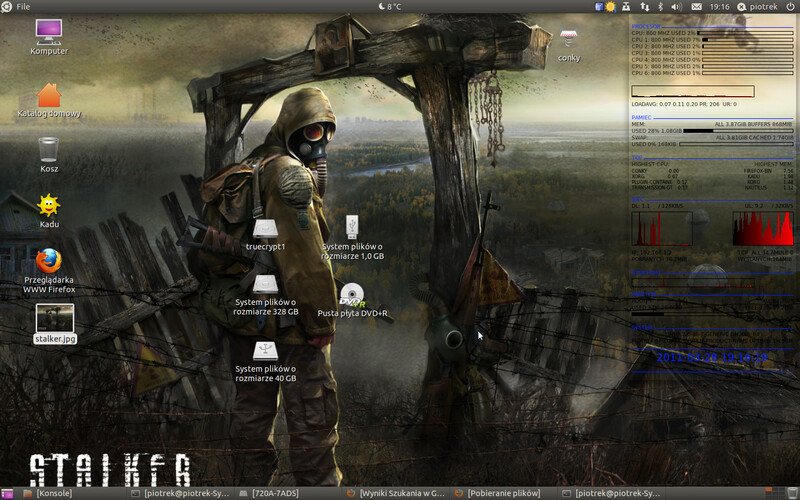 Pozazdrościłem portalsowi tych informacji o systemie wyświetlanych na pulpicie i znalazłem sobie program do Windows, który robi to samo ;). Tu na małym ekranie uboga wersja tego, co można sobie wyświetlić. Program można znaleźć na stronie http://rainmeter.net/RainCMS/