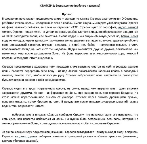 Zasobowi “Вестник «Того Самого Сталкера»” wpadł w ręce niepublikowane wcześniej streszczenie (po rosyjsku), nawiązujące do fabuły S.T.A.L.K.E.R. 2 w 2011 roku, gdzie głównym bohaterem był Striełok. Dokument projektowy na 19.04.2011r.