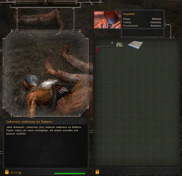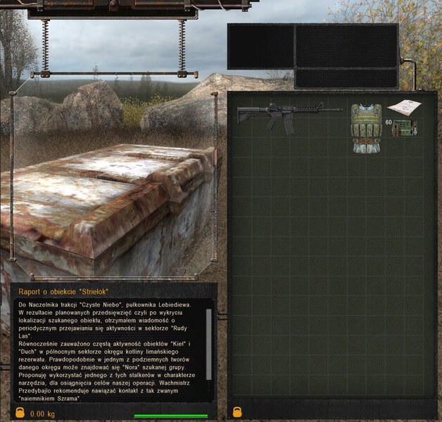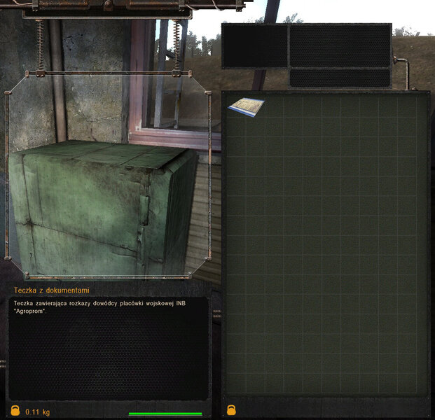 Po oddaniu kontenera z artefaktem Sidorowiczowi, handlarz poradzi nam abyśmy zapytali Wilka o możliwość zdobycia lepszej broni. Wilk poprosi GG o przyniesienie dokumentu, który znajduje się w tunelu pod nasypem kolejowym.