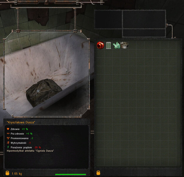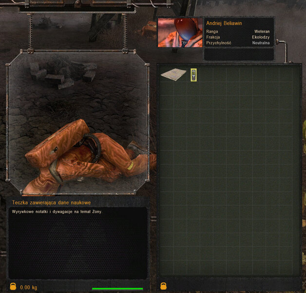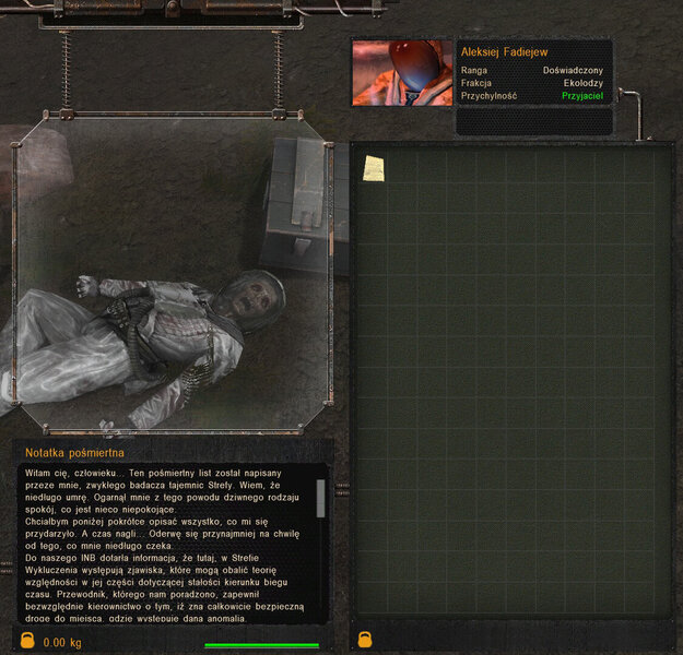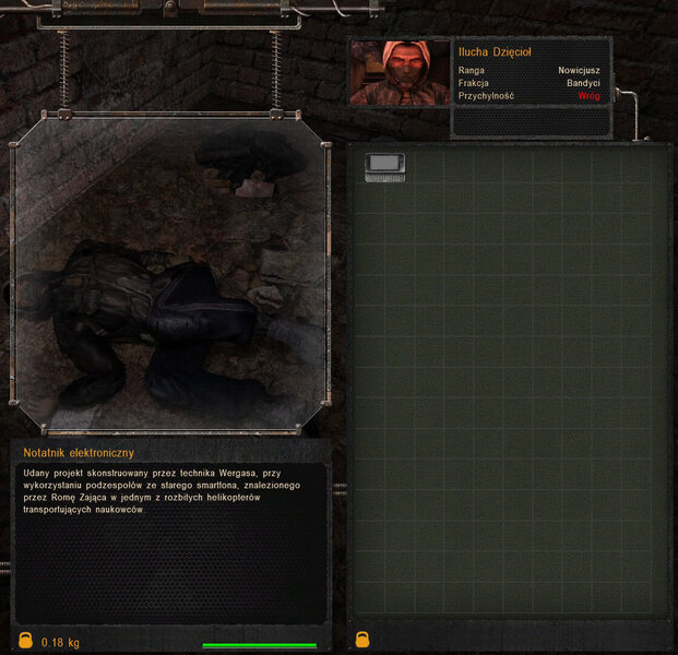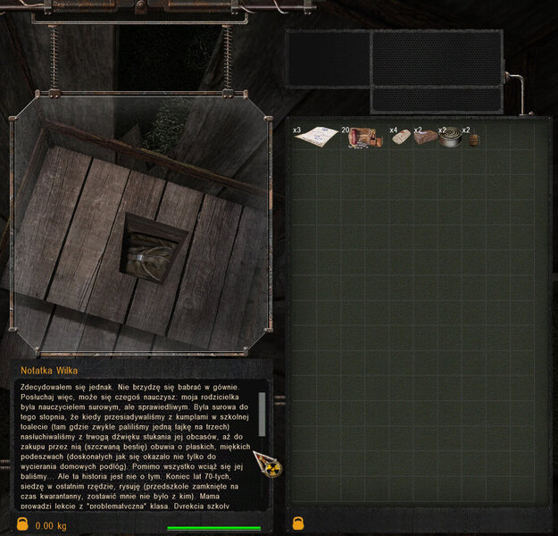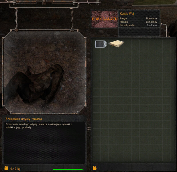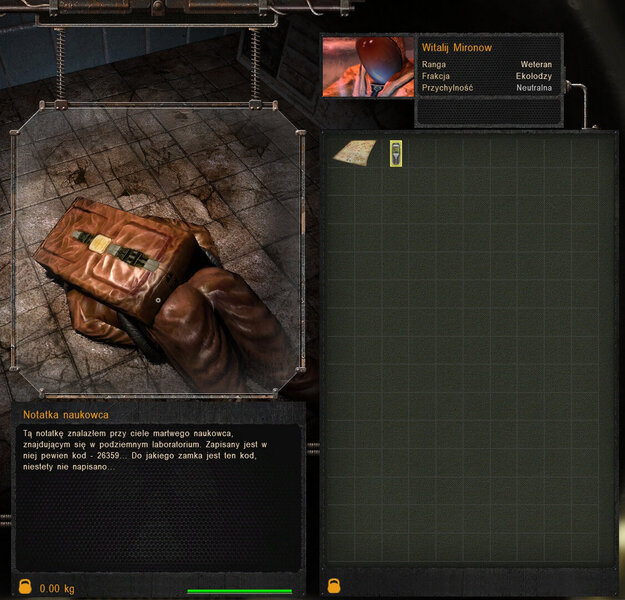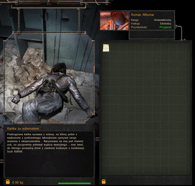 Ów szkicownik będzie można spieniężyć za około 3000 rubli lub oddać Woronowi (obozuje we fermie w DM) w ramach wymiany barterowej jako unikatowy przedmiot (ale dopiero po wyłączeniu instalacji z X-16). Woron wynagrodzi nas “zielonym” artefaktem drugiego poziomu (zielonym od koloru statystyk - jego właściwości będą wyłącznie pozytywne z racji piątego stopnia artefaktu) albo wyda namiar na schowek znajdujący się w Podziemiach Agropromu. Schowek znajduje się na górnej kondygnacji podziemi, tam gdzie jest zawalone wyjście, sąsiadujące z klatką schodową i błądzącą anomalią Elektra.