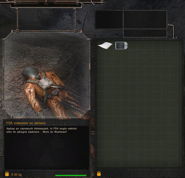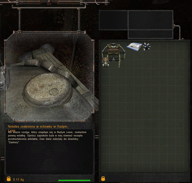 W odszyfrowanym PDA będzie informacja mówiąca, że schowek będzie znajdował się w korytarzu starej kopalni prowadzącej do zamkniętej doliny w Rudym Lesie (w plecaku leżeć będą: kapsułka artefaktu z Jeżowcem, artefakt Stalowy Kulebiak i naboje 5,56x45 AP - 90 szt.).