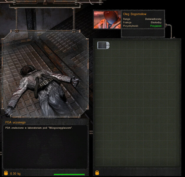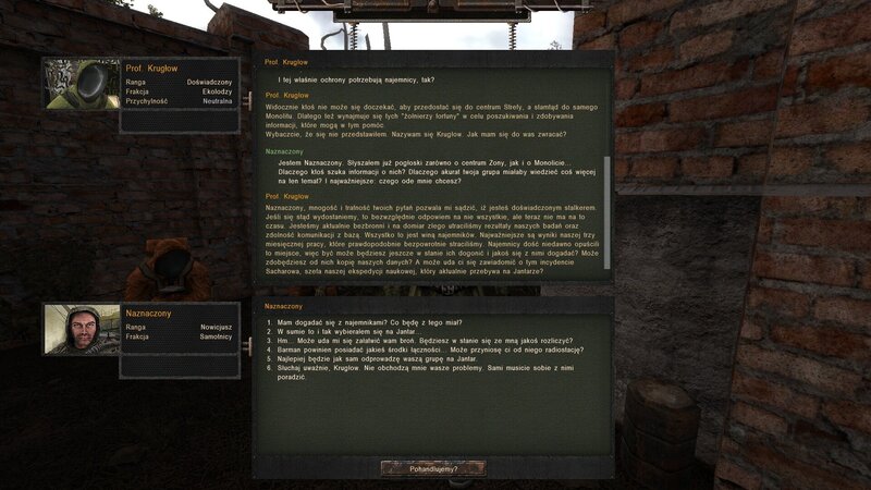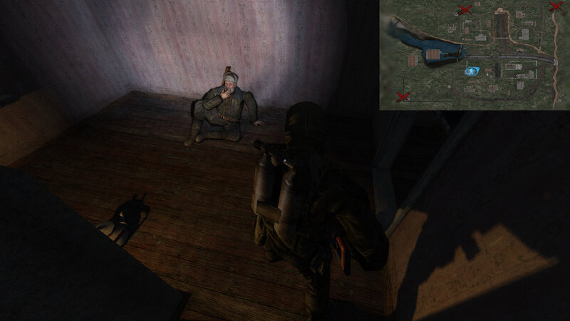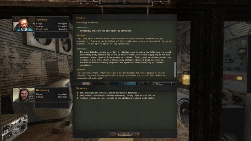 Następnie trzeba podejść do Michałycza (nie powie nam nic konkretnego) i do Zęba (opowie o naukowcu z losowym imieniem, który znajduje się w Iwankowskim Centrum Regionalnym, żądając w zamian artefaktu drugiego poziomu albo odda fleszkę z odkserowanymi informacjami za czek na tysiąc dolarów lub dwa tysiące dolarów).