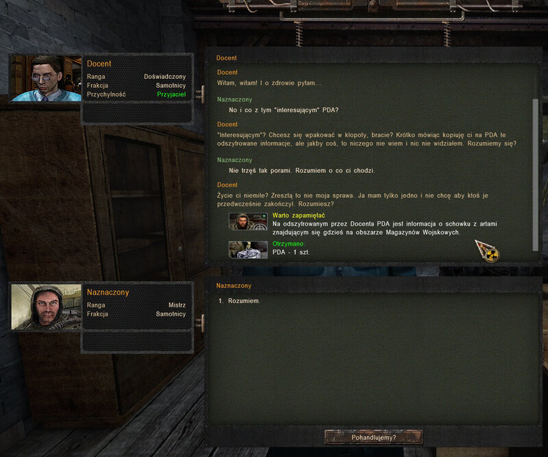 Michałycz chce poznać sekret stalkera Wróbla, którego można znaleźć przez Docenta (postawi znacznik z lokalizacją Wróbla na mapie naszego PDA w zamian za pięć PDA).