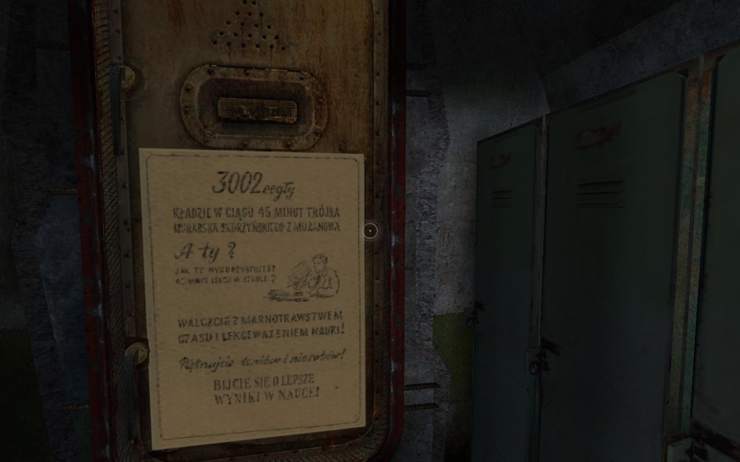 Na przykład pytanie “skąd ten plakat na drzwiach” zadane Sidorowi mogłoby rozpoczynać nowy kwest Solianki dotyczący dalszych losów Stanisława Lysta i Jurka Poliaka, którzy (jak wiadomo z kwestu na unikalna egzę CN) dzięki Sidorowi mieli wydostać sie z Zony - a może im się nie udało i chłopaki nadal gdzieś się ukrywają. Zawsze to jakiś punkt wyjścia i zaczepienia fabuły ![]()