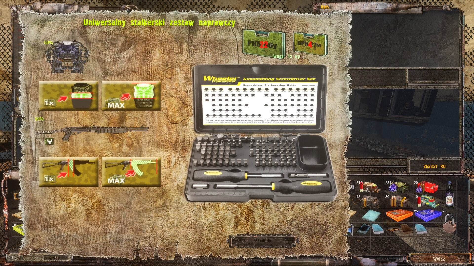 MAX - naprawia tyle procent uszkodzeń danego rodzaju sprzętu (odzieży ochronnej lub broni) ile mamy zestawów remontowych danego typu, czyli jeśli mamy 3 zestawy, to naprawi 30% uszkodzeń.