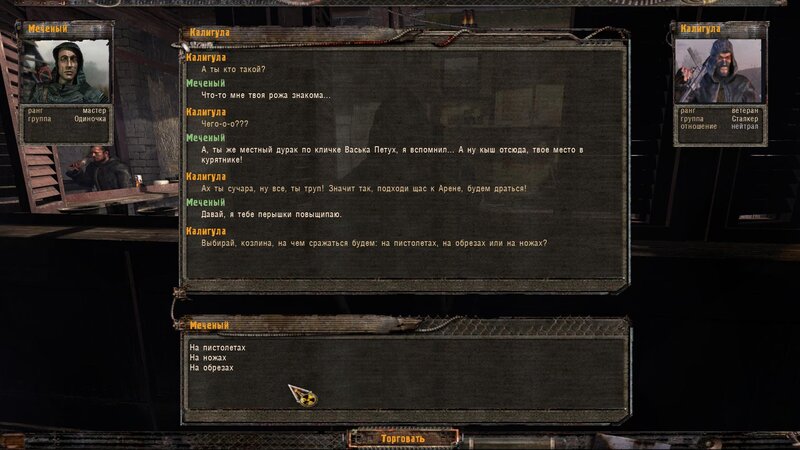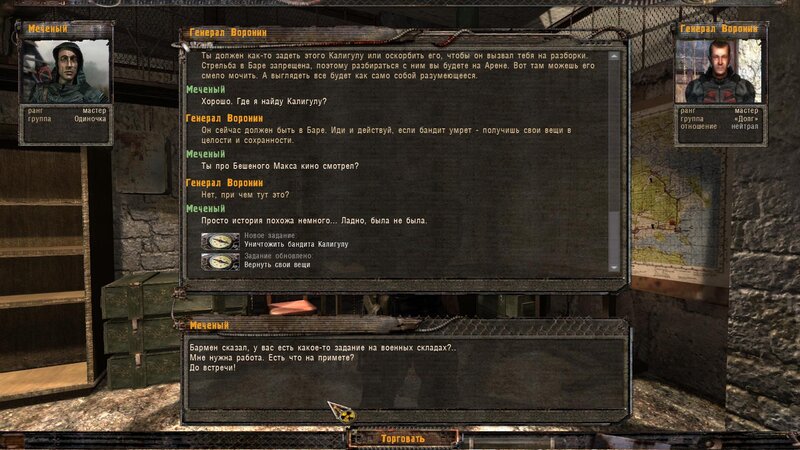 Nagle zostajemy zaatakowani przez bandytów - zbijamy ich. Odnogłaz jest martwy. Z PDA Kniazia dowiadujemy się gdzie szukać fleszki - jest na pace Ziła w skrzyni. Kiedy ją zabieramy dostajemy w łeb i zostajemy pozbawieni inwentarza - lepiej wszystko schować, przynajmniej latarkę. Jesteżmy w pace u Powinności. Wybieramy opcję dialogową, że powiemy wszystko. Puszczają nas na razie w skarpetkach. Mówimy z Woroninem - mamy się rozprawić na arenie z Kaligulą - ten siedzi w Barze. Zabijamy drania - zabieramy fajny art i teraz mówimy ponownie z Woroninem.