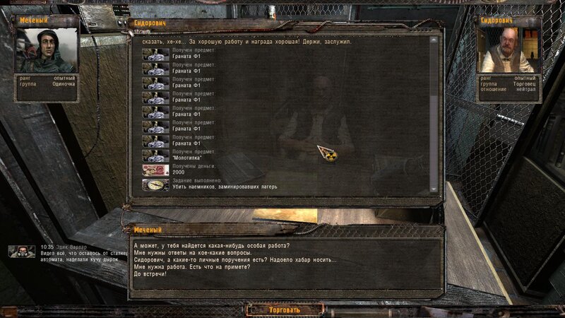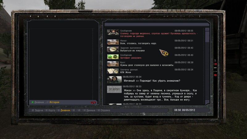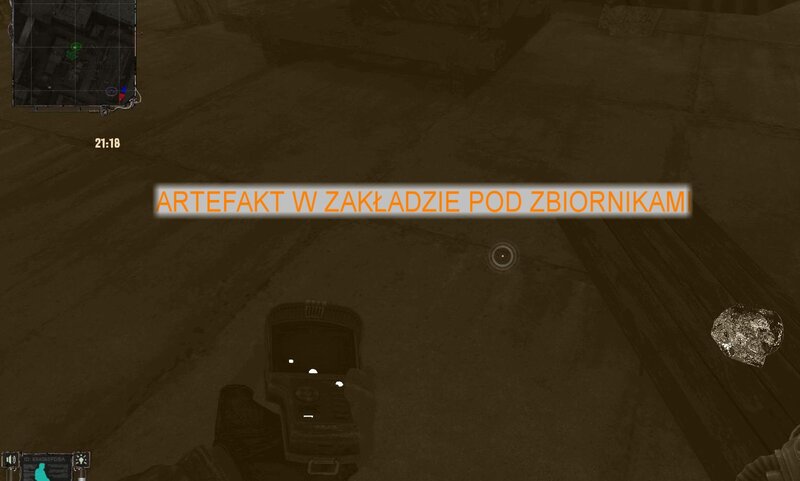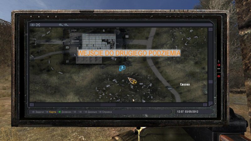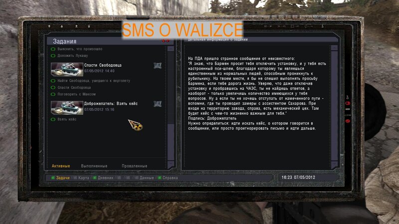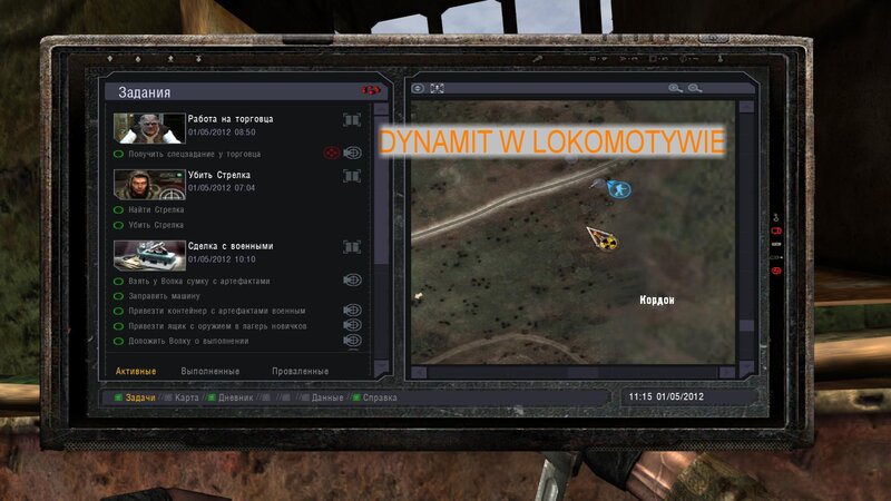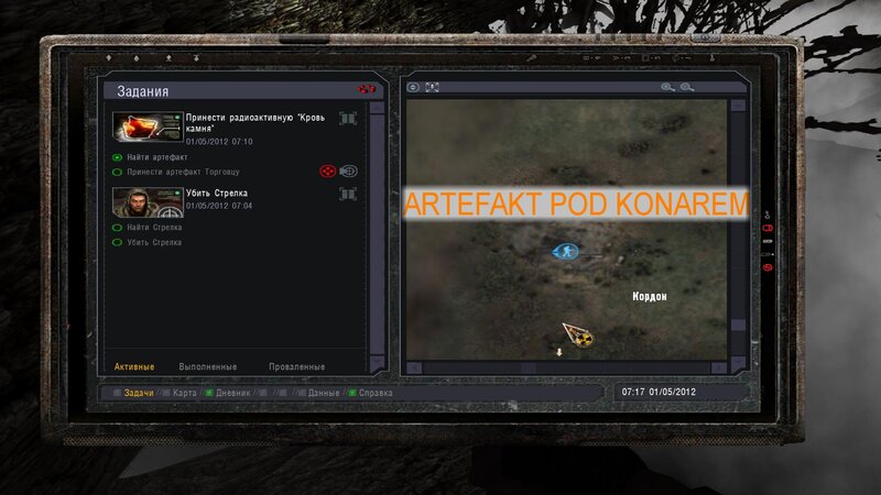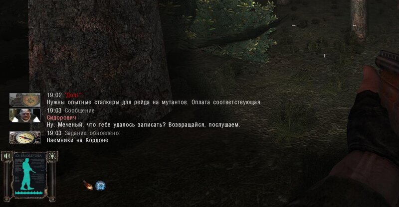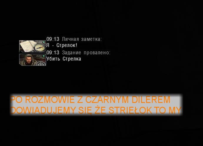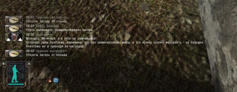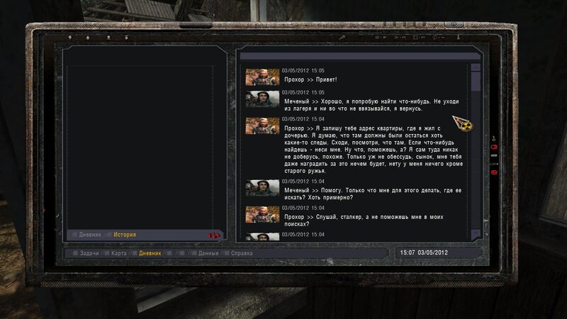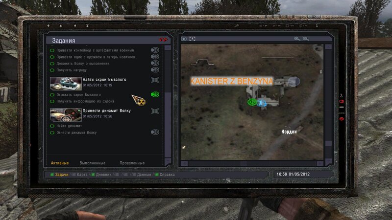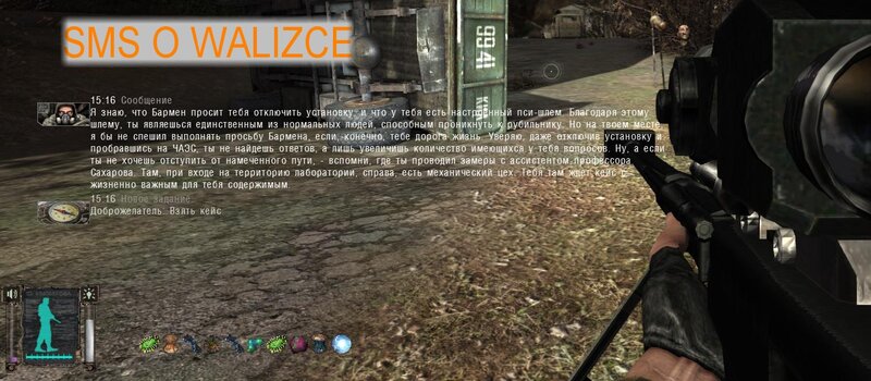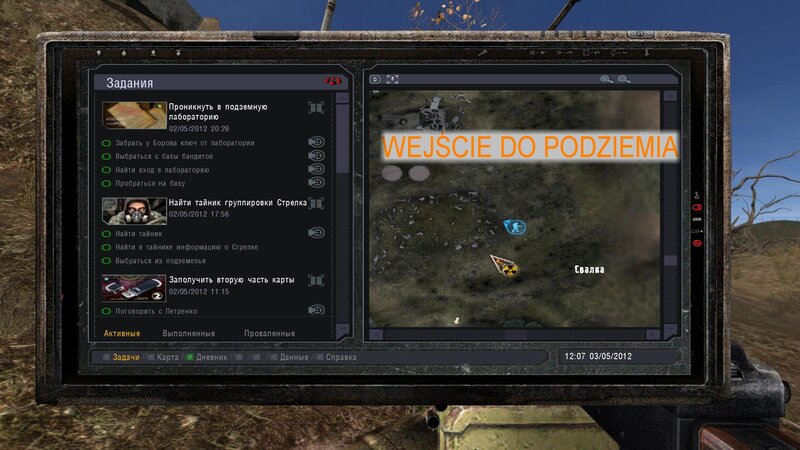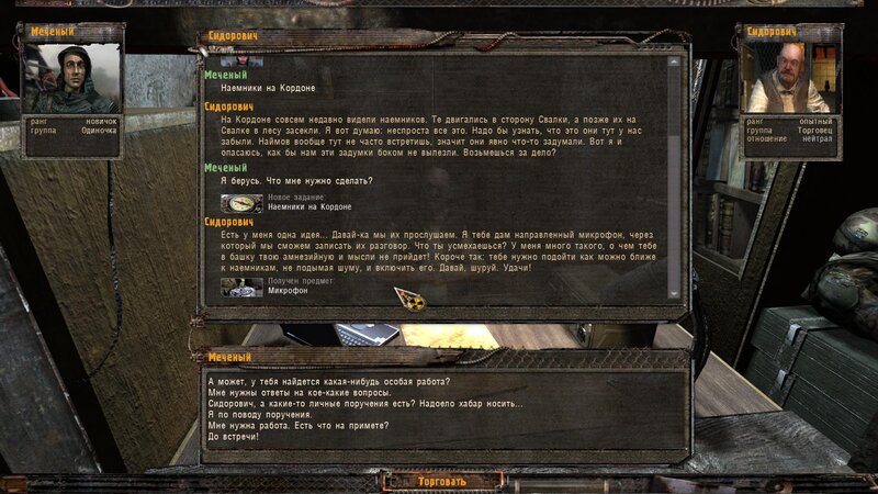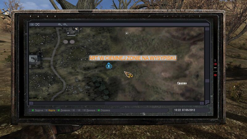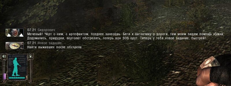 Po zabraniu artu i ucieczce wojsko zaczyna strzelać - ja ich wykończyłem. Wojsko pod mostem pomimo tego nie strzela. Dostajemy kasę od Sidora. Kolejne zadanie jakie od niego wziąłem to podsłuchanie najemników na Wysypisku. Kiedy podchodzimy do ich grupy podświetla nam się zadanie by wyciągnąć mikrofon kierunkowy - klikamy na niego w inwentarzu i przez 45 sekund nagrywamy. Po sprawie przychodzi SMS od Sidora. Podczas emisji mamy ciekawe menu PDA.