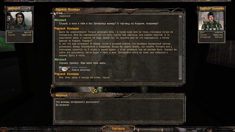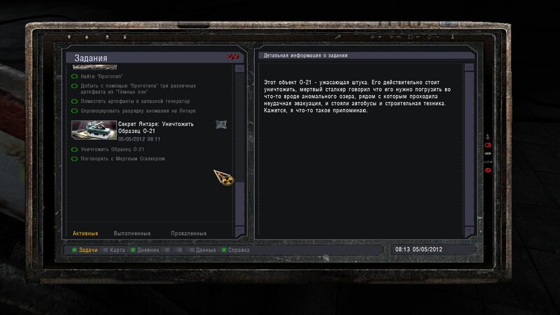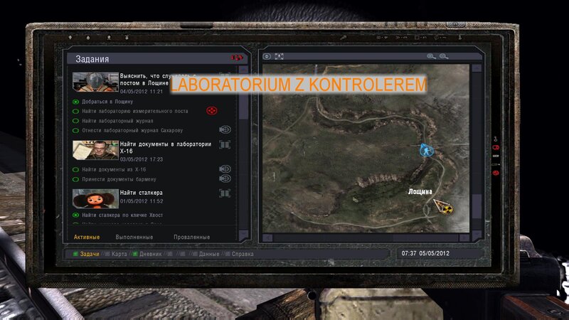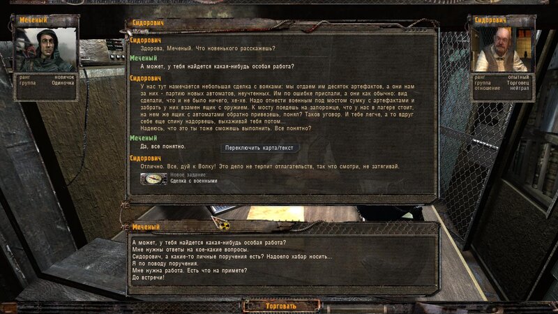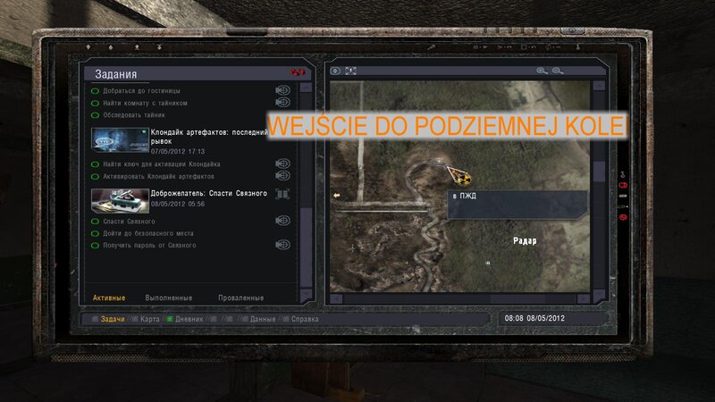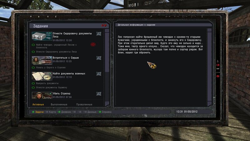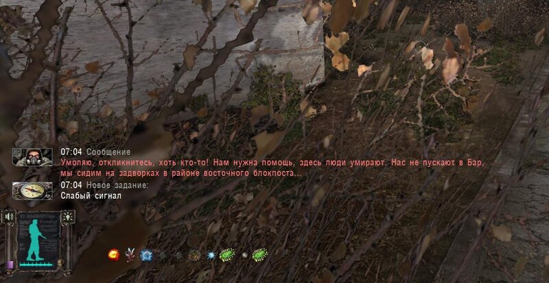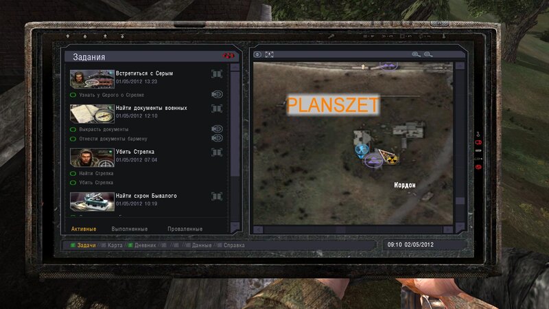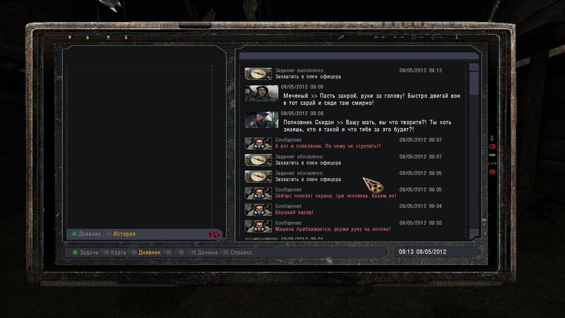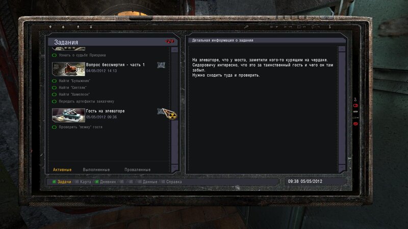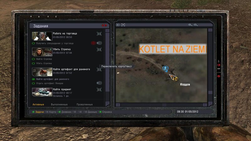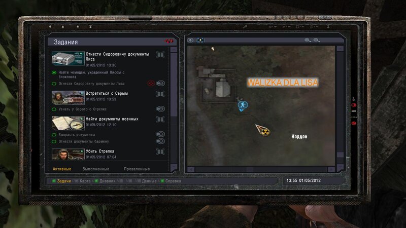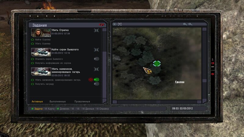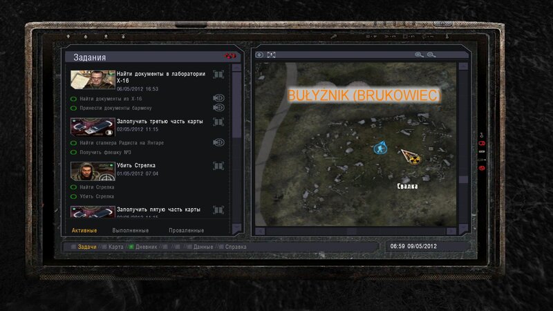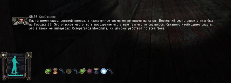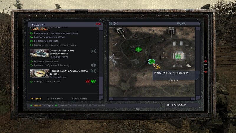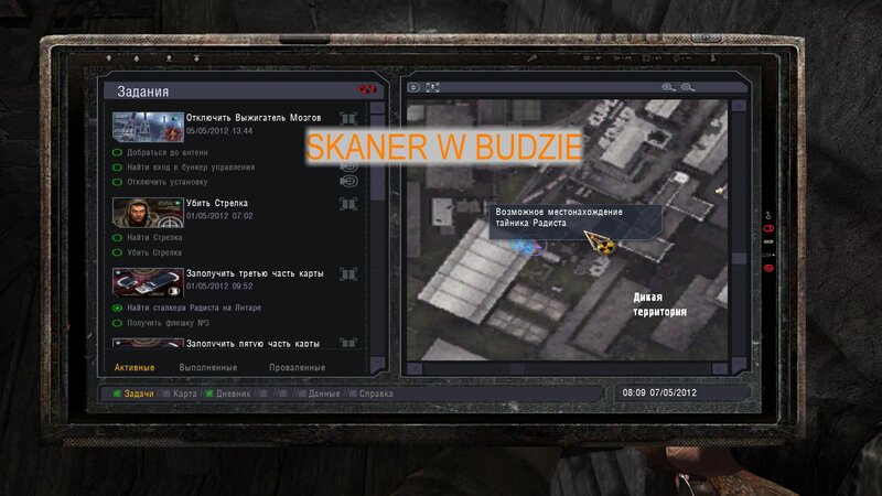 Po zabraniu artu i ucieczce wojsko zaczyna strzelać - ja ich wykończyłem. Wojsko pod mostem pomimo tego nie strzela. Dostajemy kasę od Sidora. Kolejne zadanie jakie od niego wziąłem to podsłuchanie najemników na Wysypisku. Kiedy podchodzimy do ich grupy podświetla nam się zadanie by wyciągnąć mikrofon kierunkowy - klikamy na niego w inwentarzu i przez 45 sekund nagrywamy. Po sprawie przychodzi SMS od Sidora. Podczas emisji mamy ciekawe menu PDA.