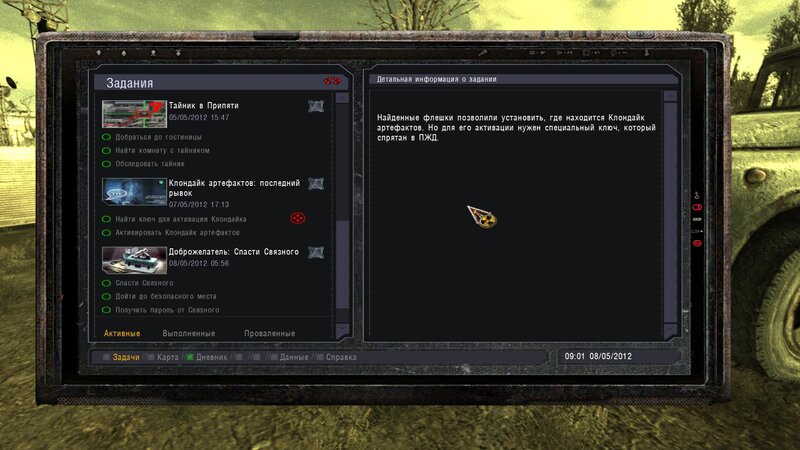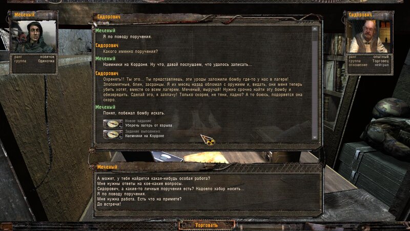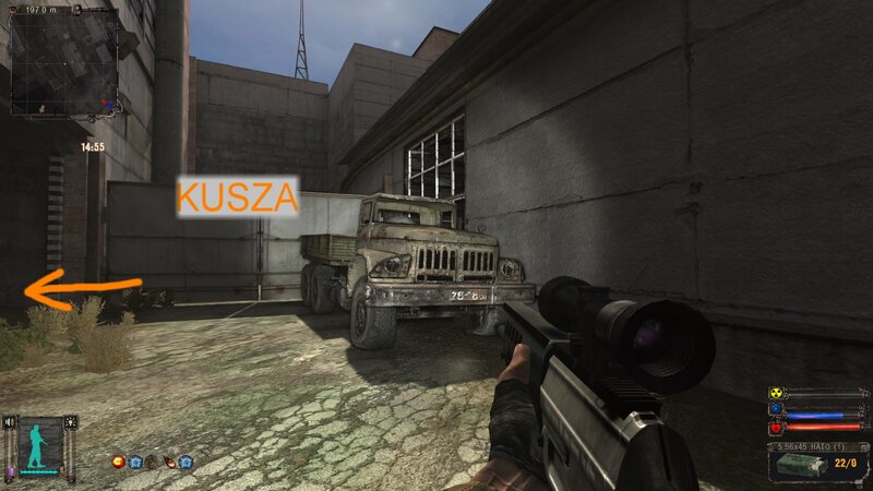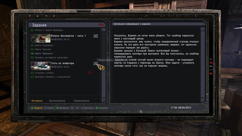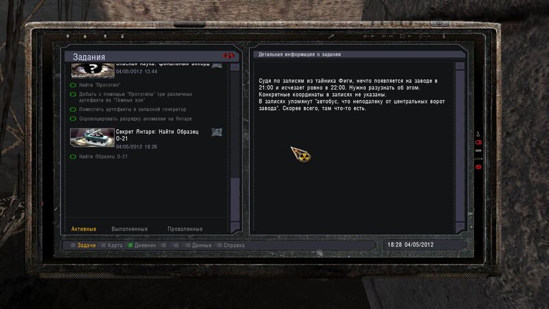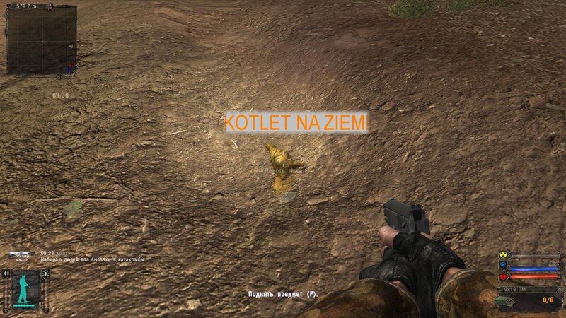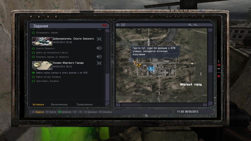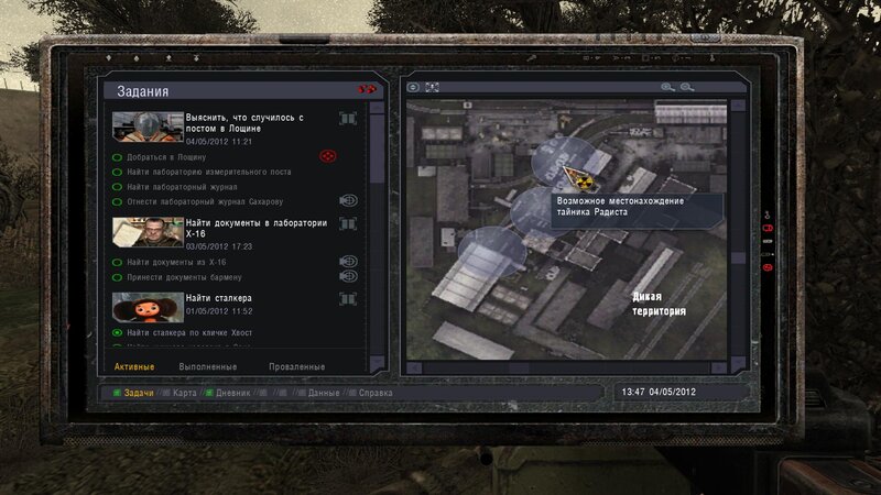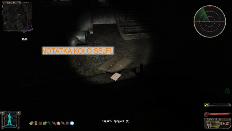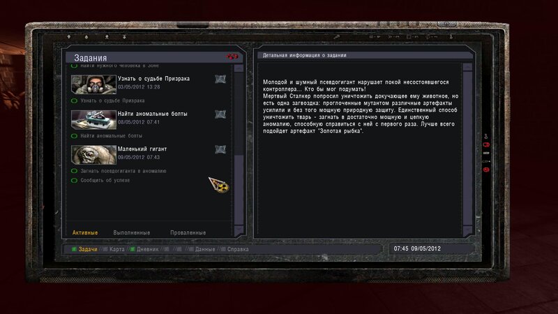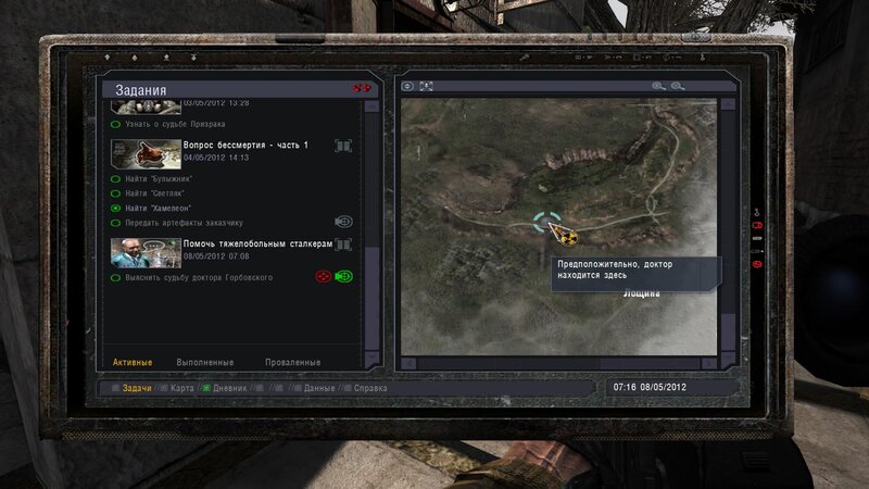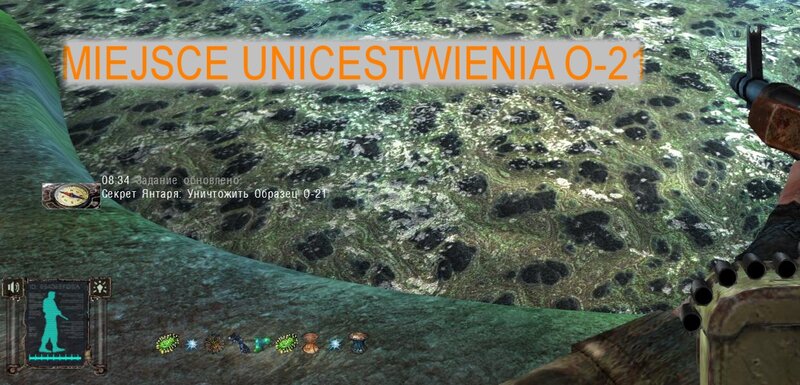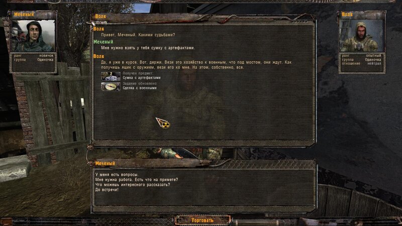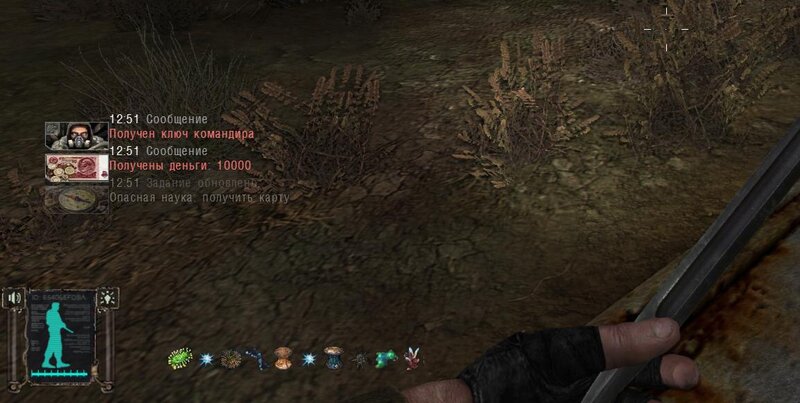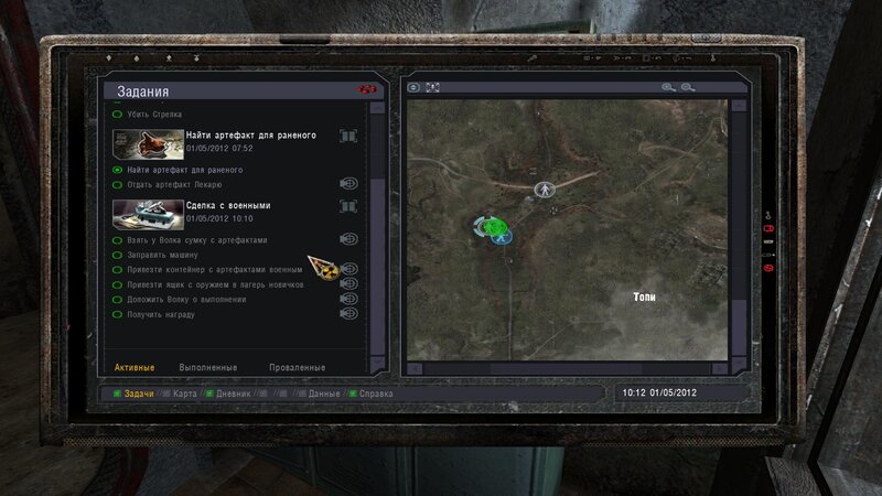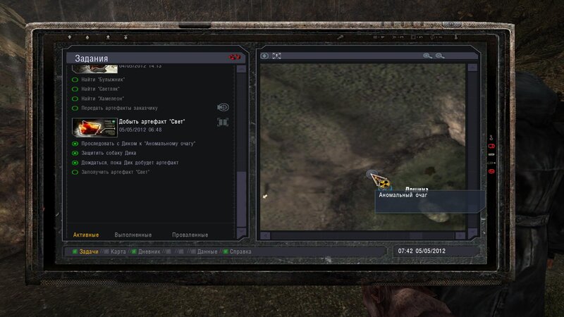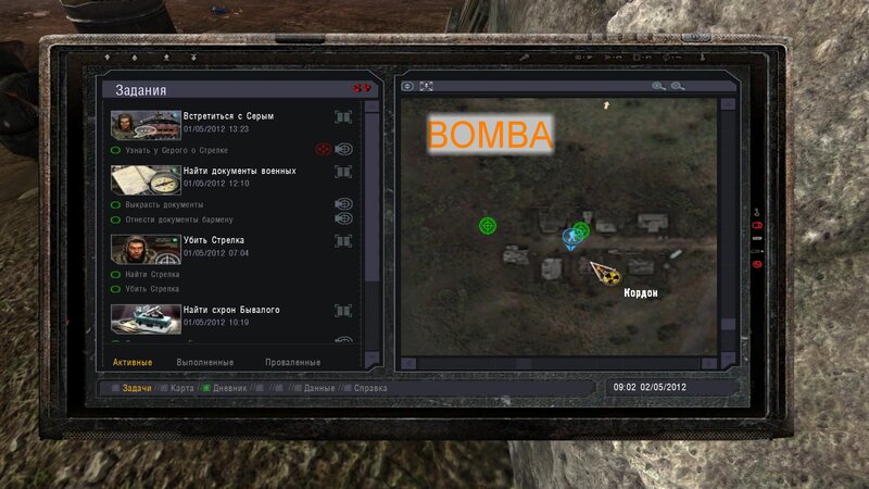 Po zabraniu artu i ucieczce wojsko zaczyna strzelać - ja ich wykończyłem. Wojsko pod mostem pomimo tego nie strzela. Dostajemy kasę od Sidora. Kolejne zadanie jakie od niego wziąłem to podsłuchanie najemników na Wysypisku. Kiedy podchodzimy do ich grupy podświetla nam się zadanie by wyciągnąć mikrofon kierunkowy - klikamy na niego w inwentarzu i przez 45 sekund nagrywamy. Po sprawie przychodzi SMS od Sidora. Podczas emisji mamy ciekawe menu PDA.