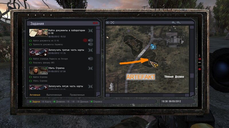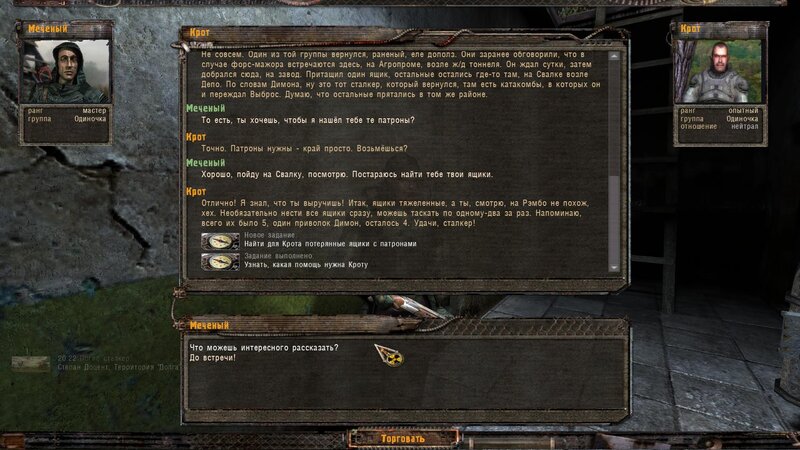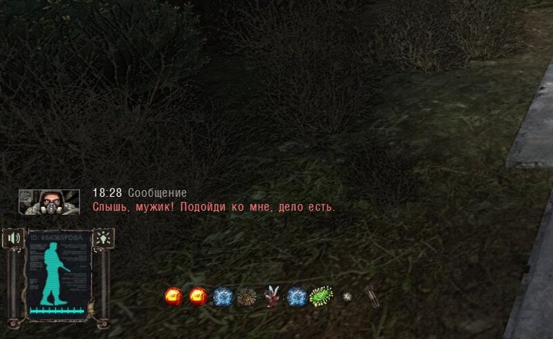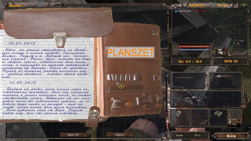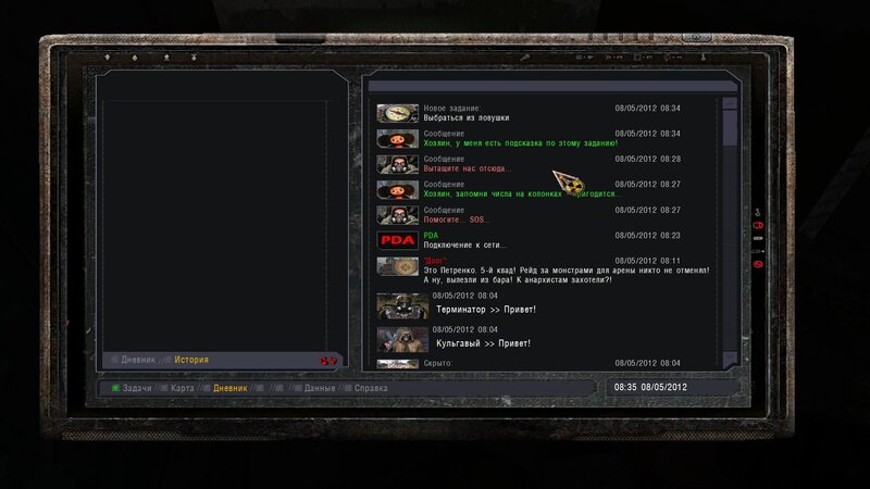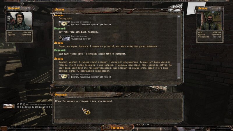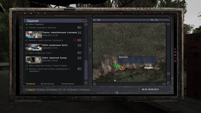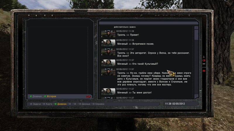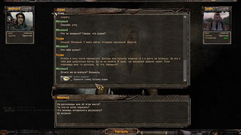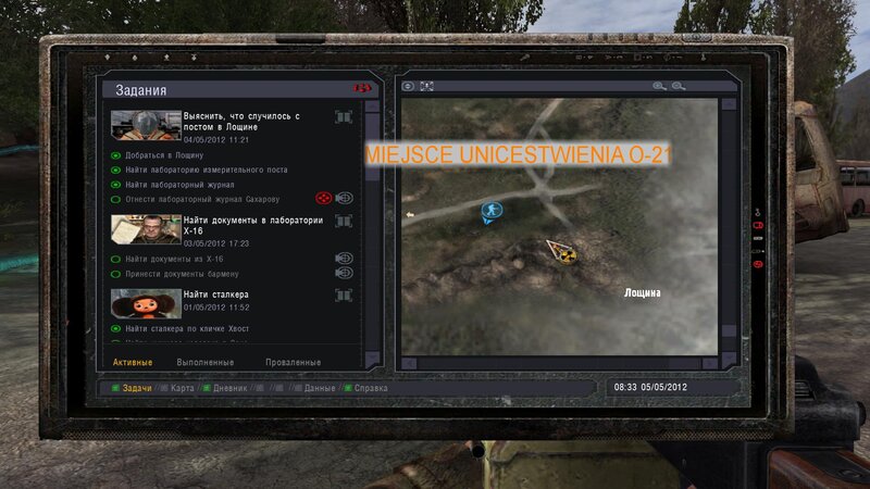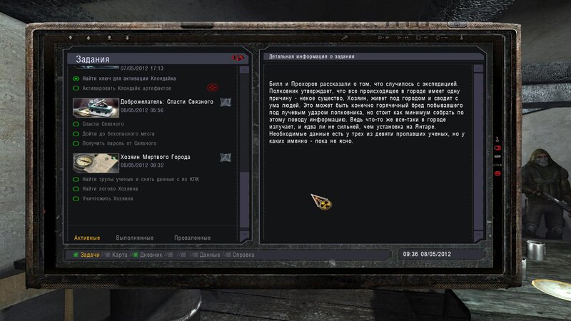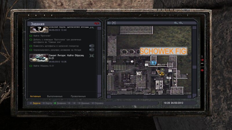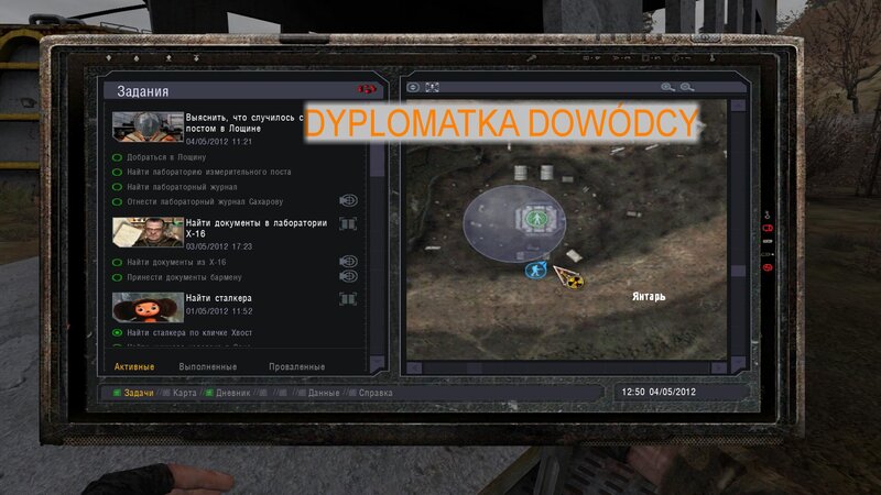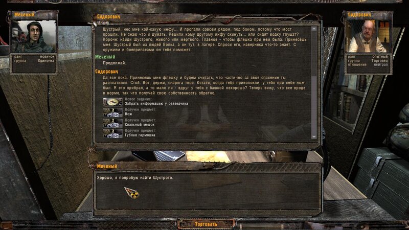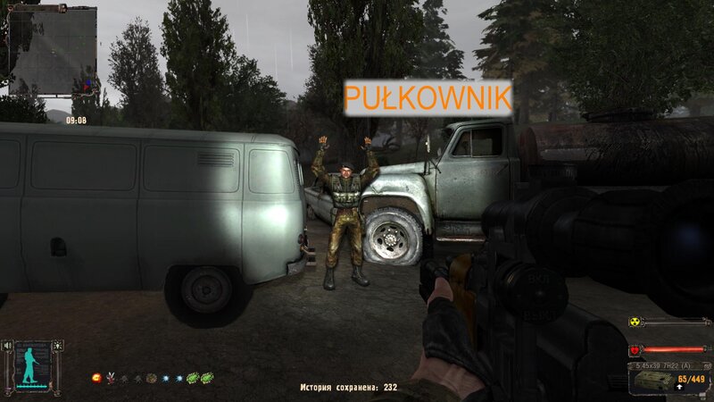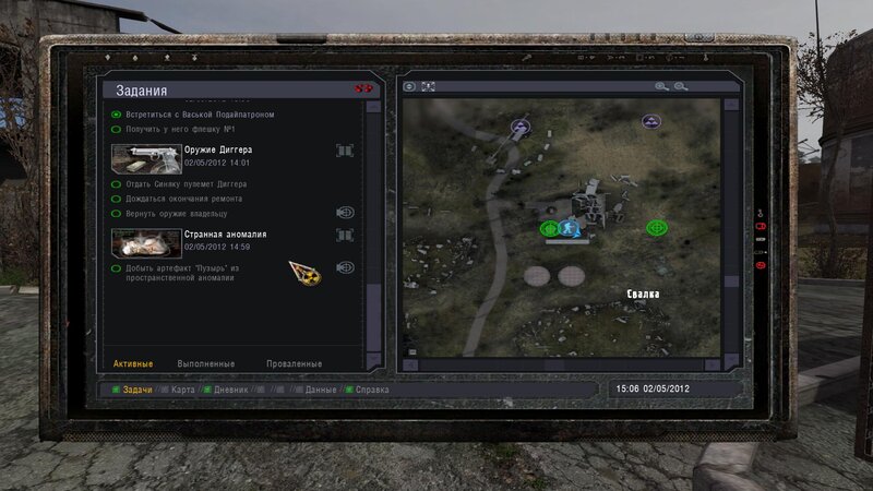 Po zabraniu artu i ucieczce wojsko zaczyna strzelać - ja ich wykończyłem. Wojsko pod mostem pomimo tego nie strzela. Dostajemy kasę od Sidora. Kolejne zadanie jakie od niego wziąłem to podsłuchanie najemników na Wysypisku. Kiedy podchodzimy do ich grupy podświetla nam się zadanie by wyciągnąć mikrofon kierunkowy - klikamy na niego w inwentarzu i przez 45 sekund nagrywamy. Po sprawie przychodzi SMS od Sidora. Podczas emisji mamy ciekawe menu PDA.