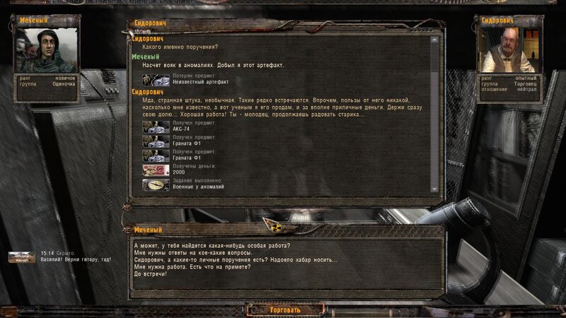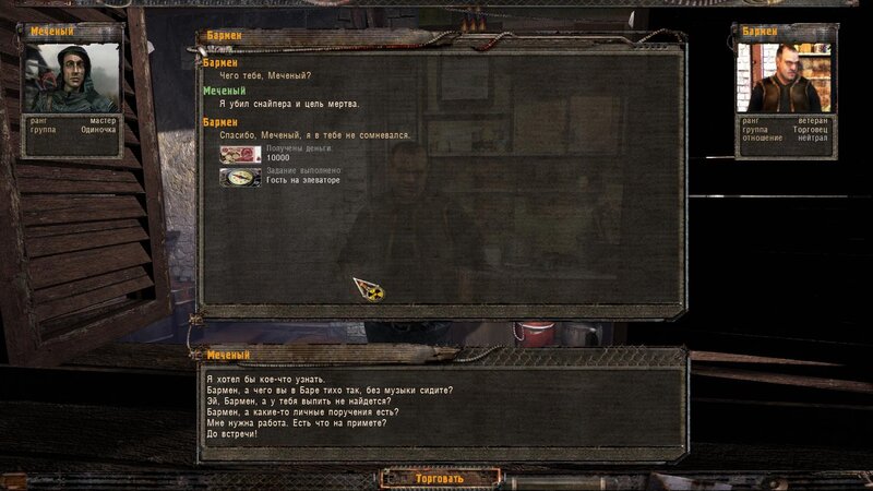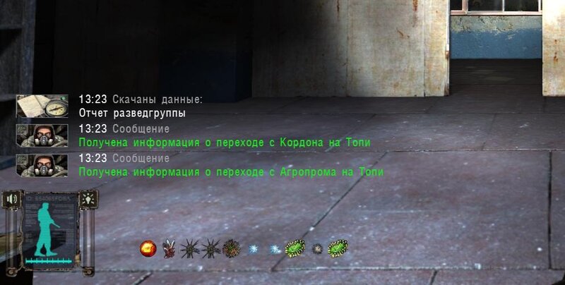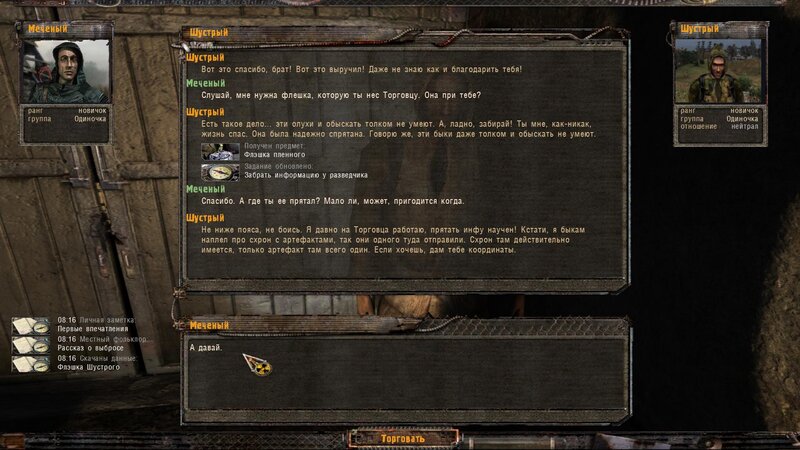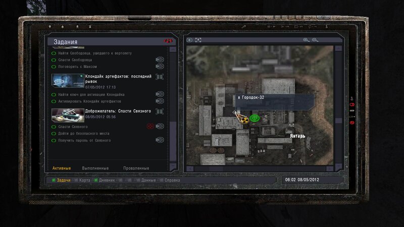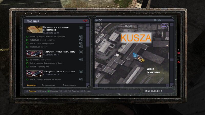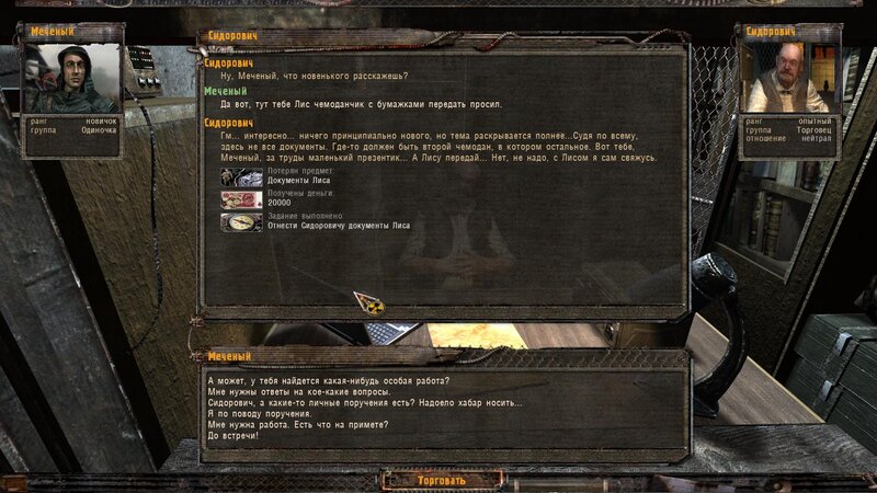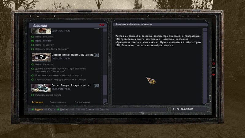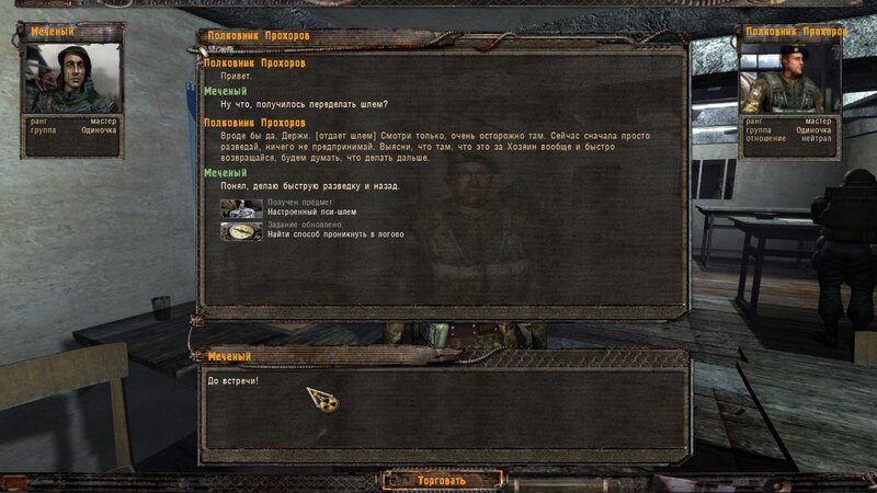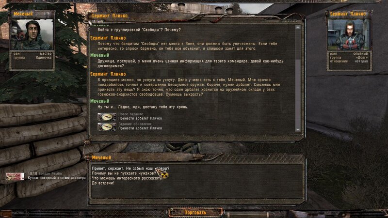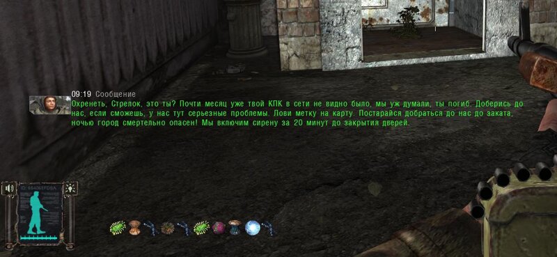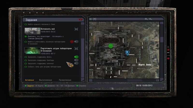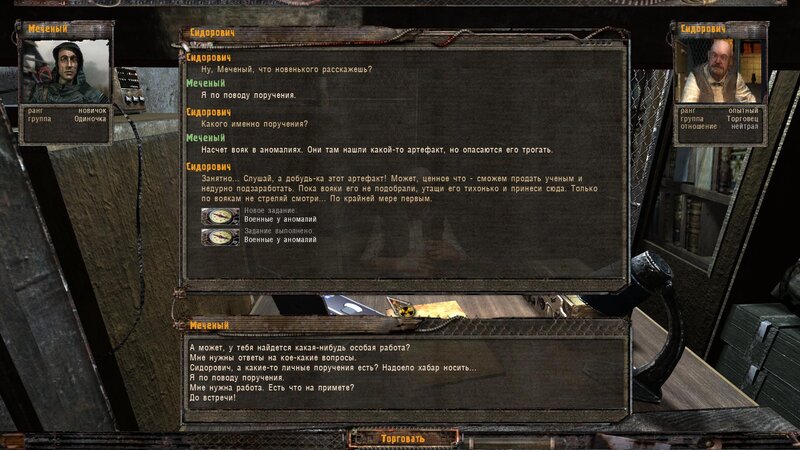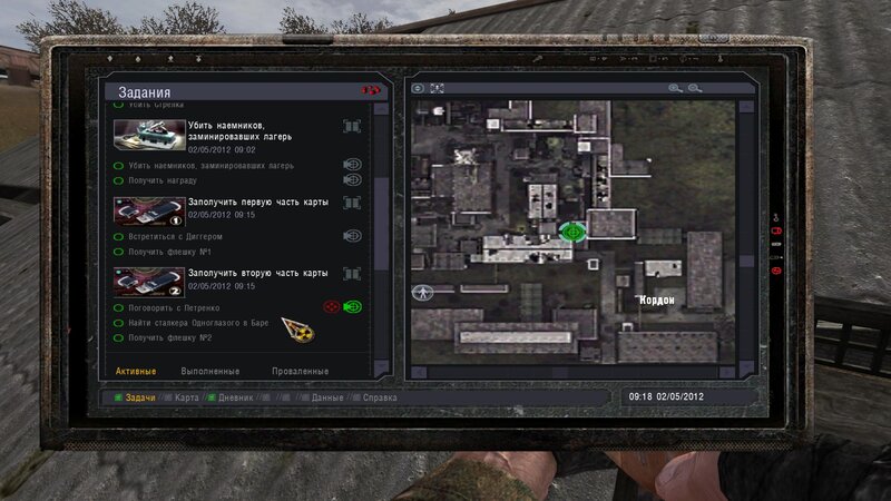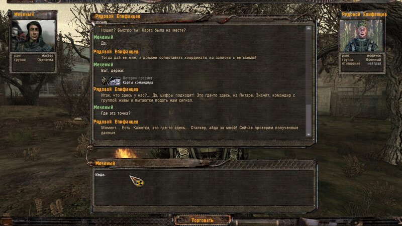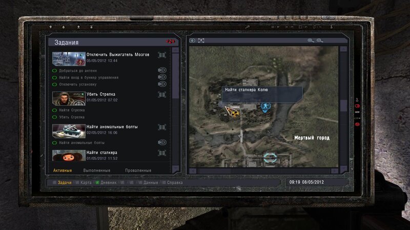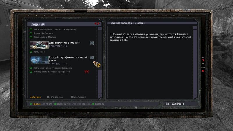 Po zabraniu artu i ucieczce wojsko zaczyna strzelać - ja ich wykończyłem. Wojsko pod mostem pomimo tego nie strzela. Dostajemy kasę od Sidora. Kolejne zadanie jakie od niego wziąłem to podsłuchanie najemników na Wysypisku. Kiedy podchodzimy do ich grupy podświetla nam się zadanie by wyciągnąć mikrofon kierunkowy - klikamy na niego w inwentarzu i przez 45 sekund nagrywamy. Po sprawie przychodzi SMS od Sidora. Podczas emisji mamy ciekawe menu PDA.