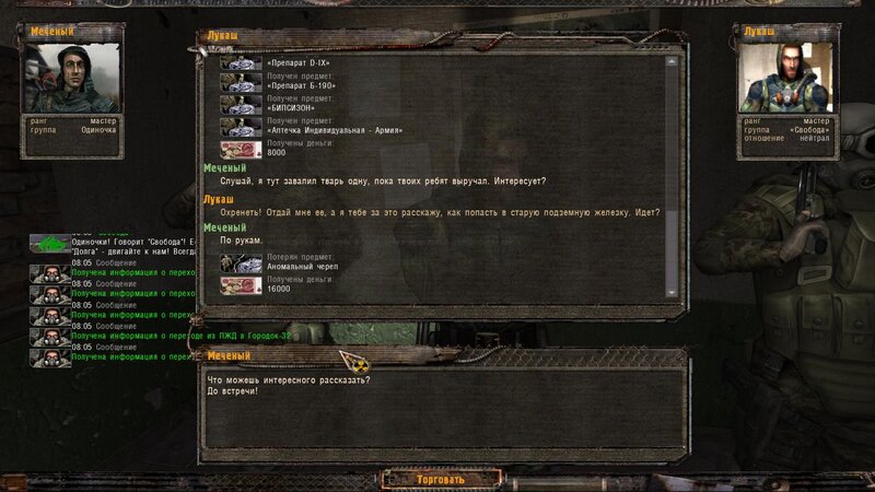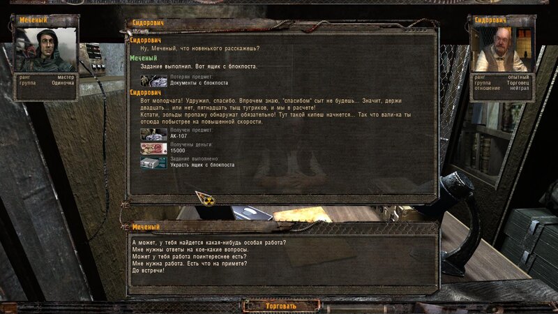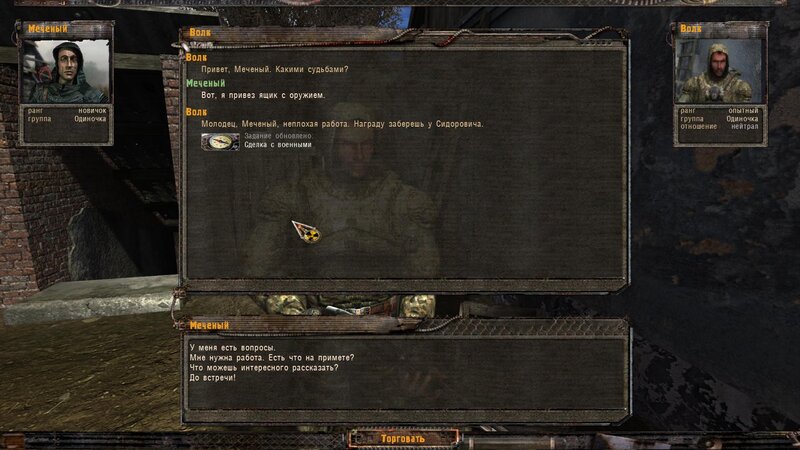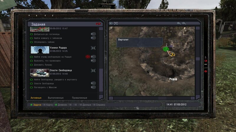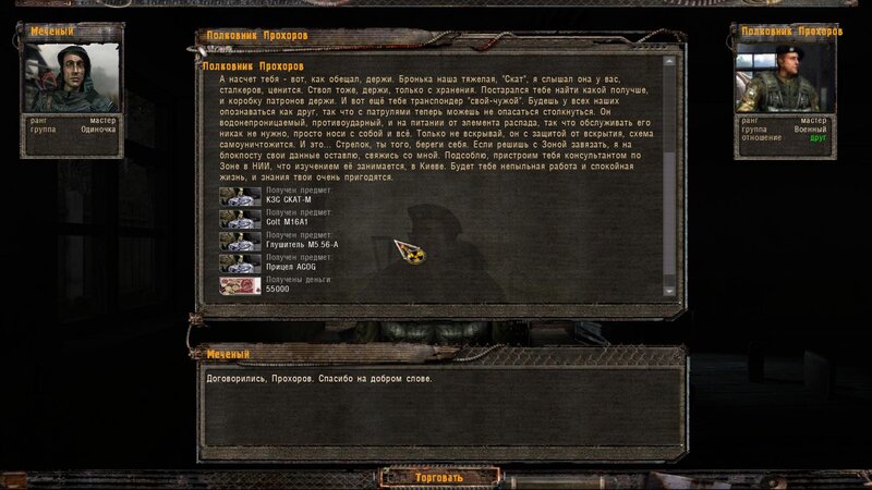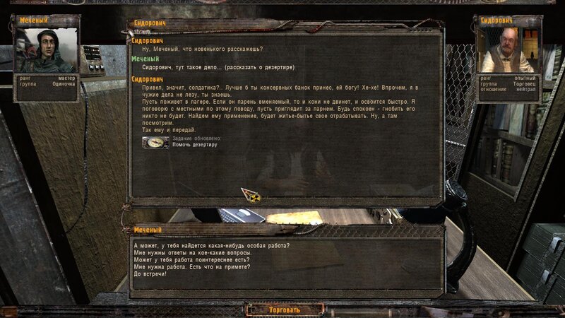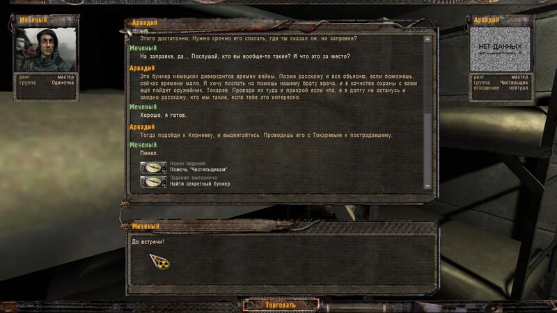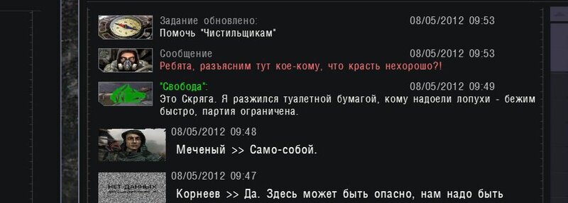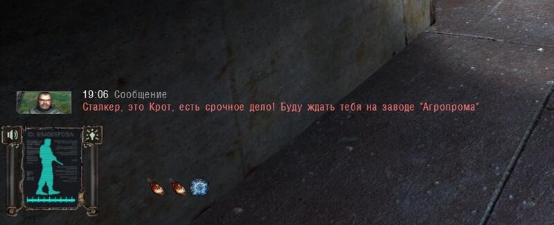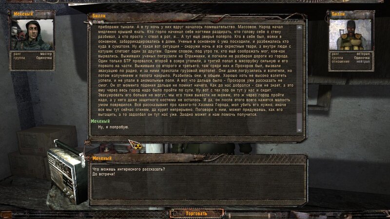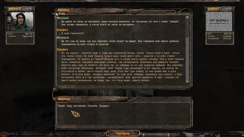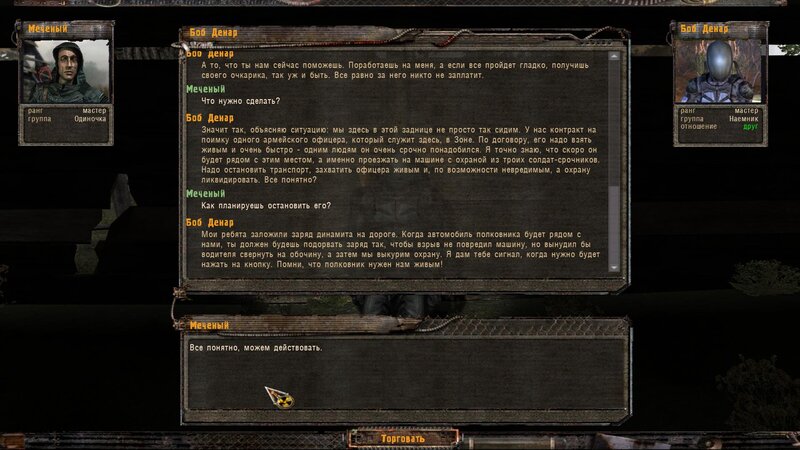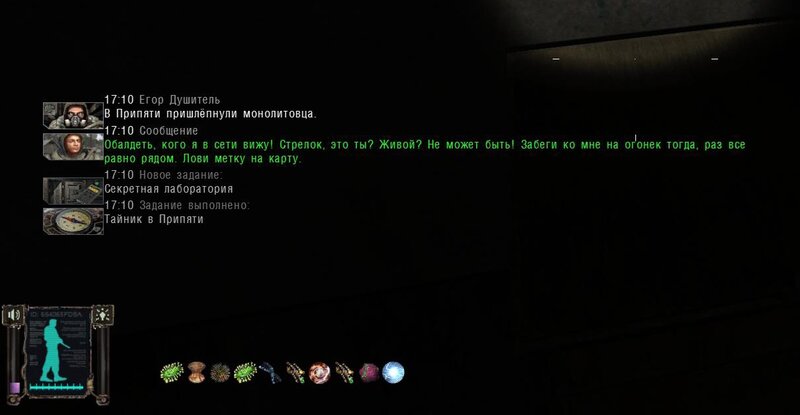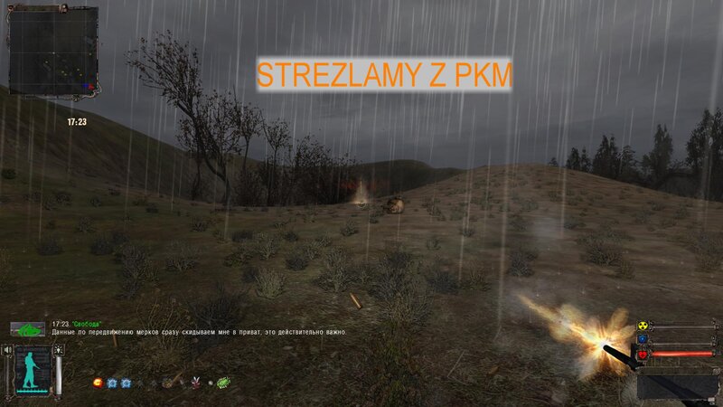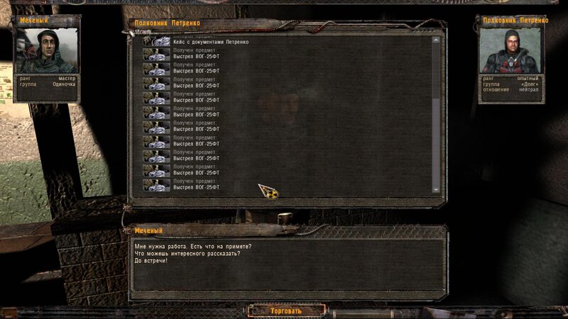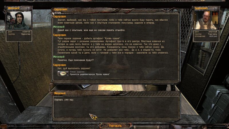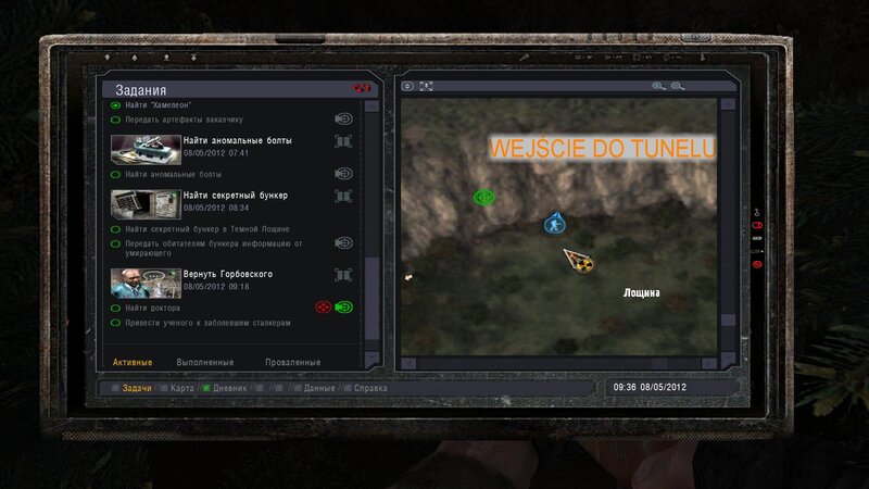 Po zabraniu artu i ucieczce wojsko zaczyna strzelać - ja ich wykończyłem. Wojsko pod mostem pomimo tego nie strzela. Dostajemy kasę od Sidora. Kolejne zadanie jakie od niego wziąłem to podsłuchanie najemników na Wysypisku. Kiedy podchodzimy do ich grupy podświetla nam się zadanie by wyciągnąć mikrofon kierunkowy - klikamy na niego w inwentarzu i przez 45 sekund nagrywamy. Po sprawie przychodzi SMS od Sidora. Podczas emisji mamy ciekawe menu PDA.