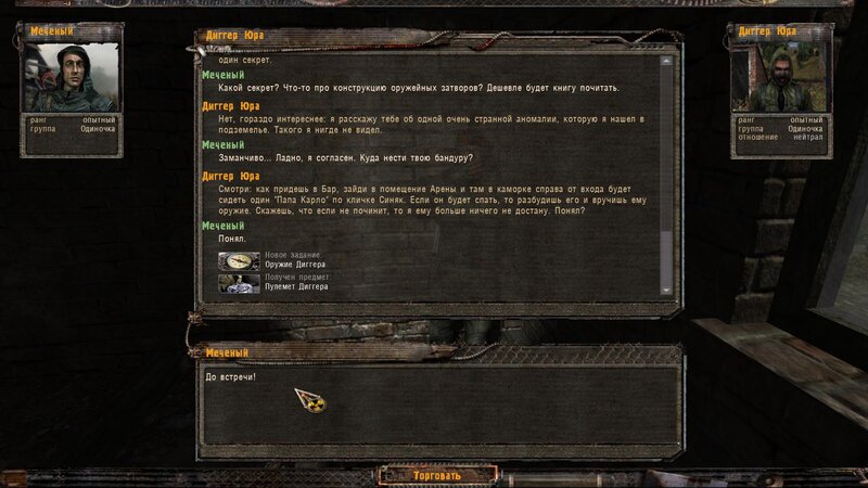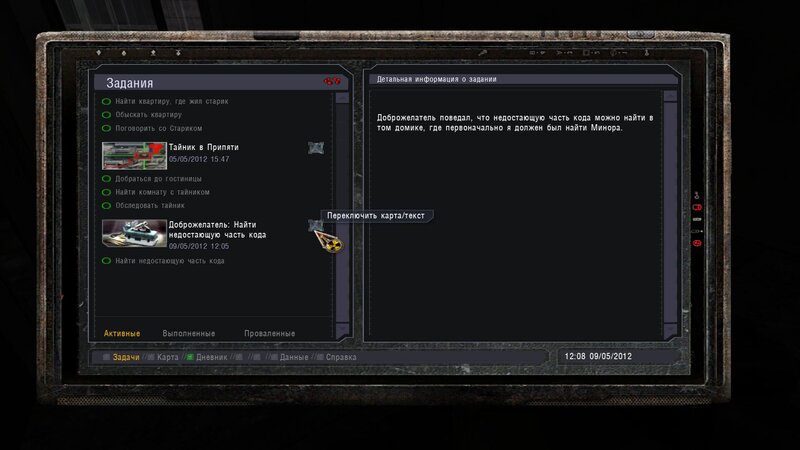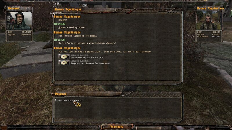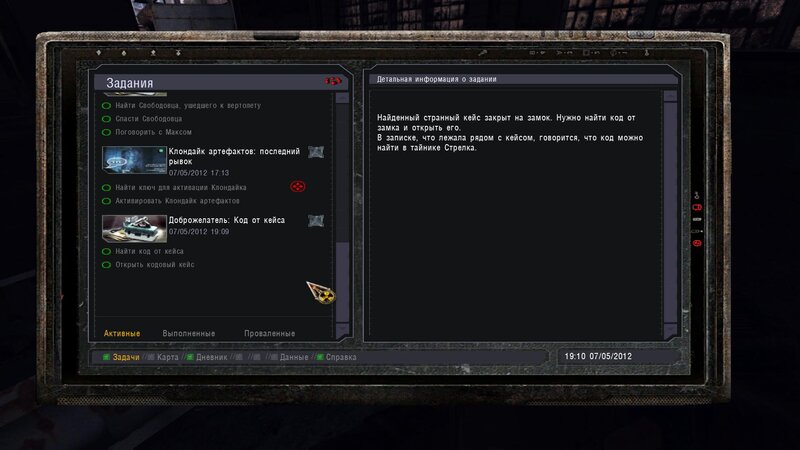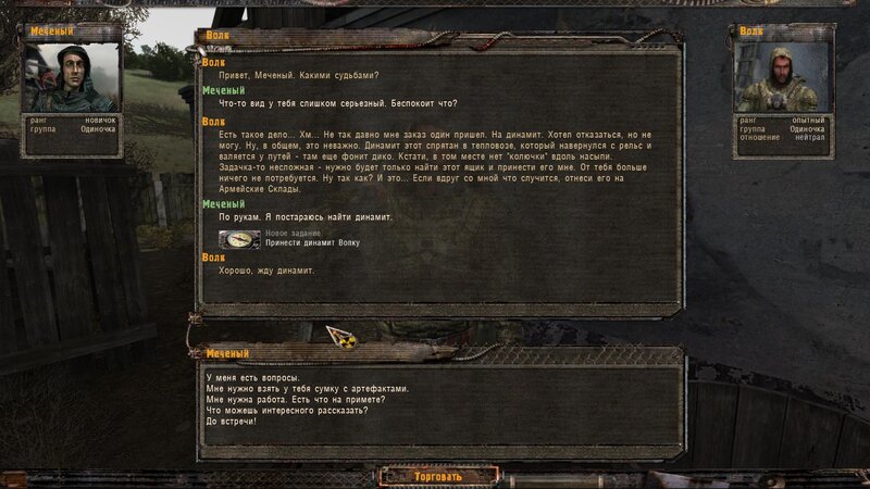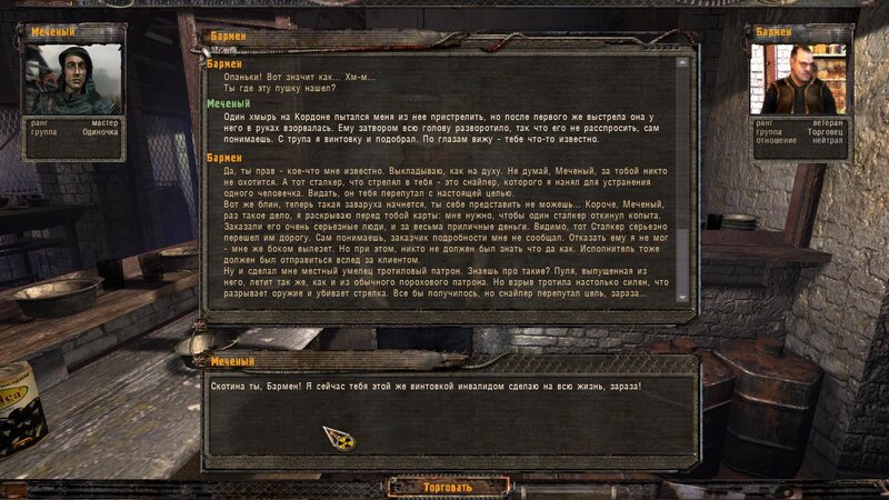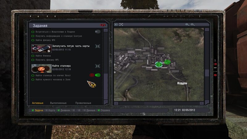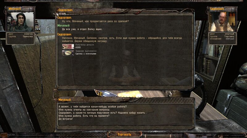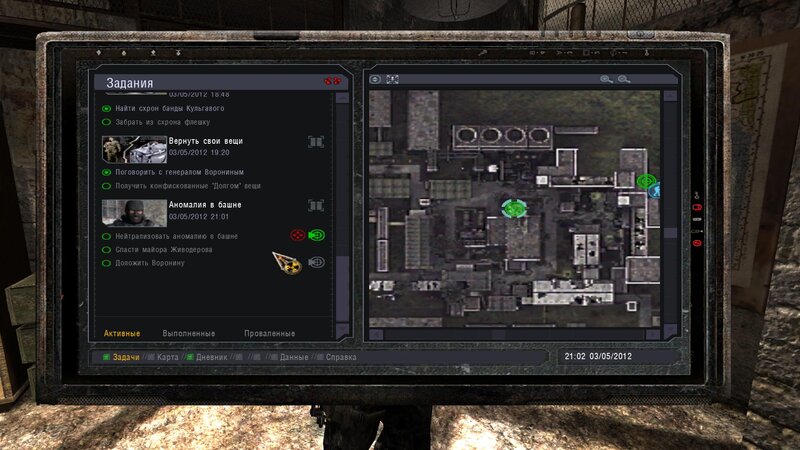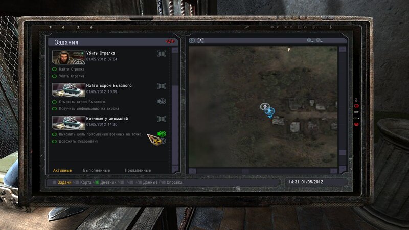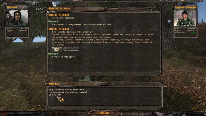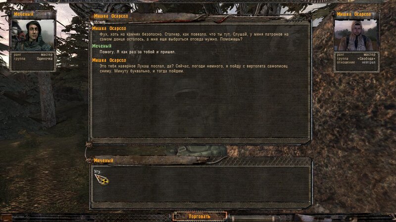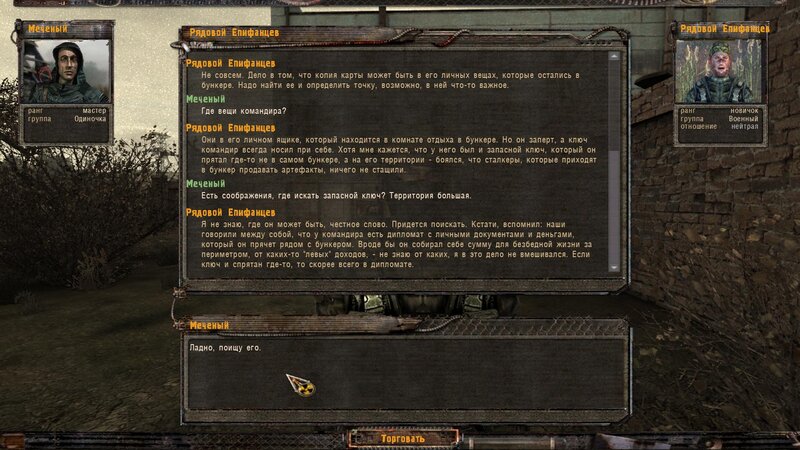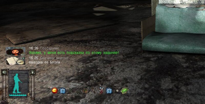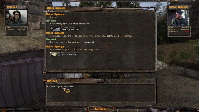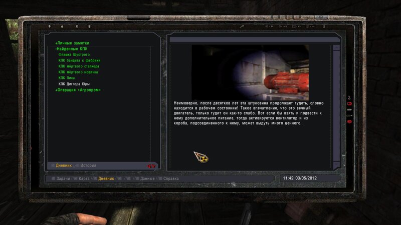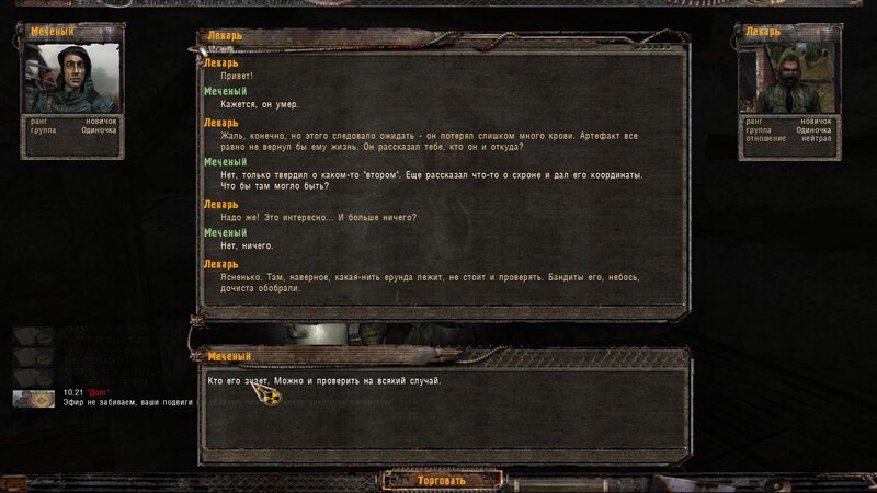 Po zabraniu artu i ucieczce wojsko zaczyna strzelać - ja ich wykończyłem. Wojsko pod mostem pomimo tego nie strzela. Dostajemy kasę od Sidora. Kolejne zadanie jakie od niego wziąłem to podsłuchanie najemników na Wysypisku. Kiedy podchodzimy do ich grupy podświetla nam się zadanie by wyciągnąć mikrofon kierunkowy - klikamy na niego w inwentarzu i przez 45 sekund nagrywamy. Po sprawie przychodzi SMS od Sidora. Podczas emisji mamy ciekawe menu PDA.