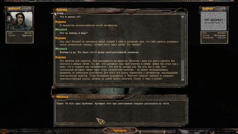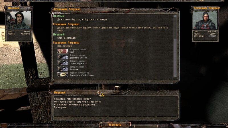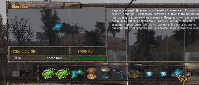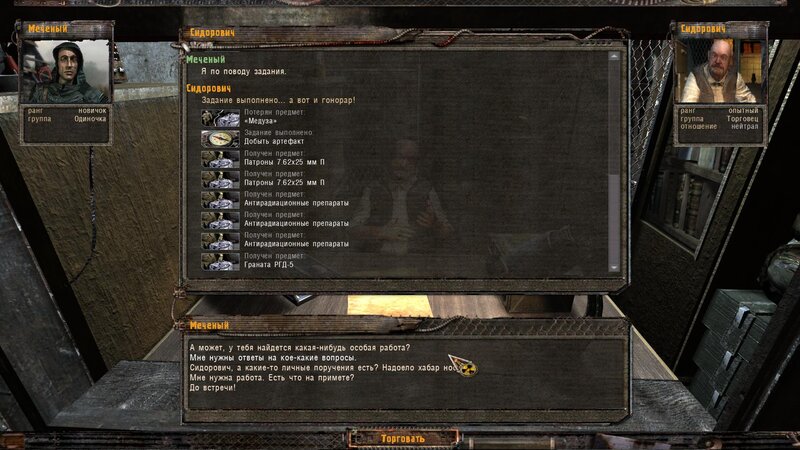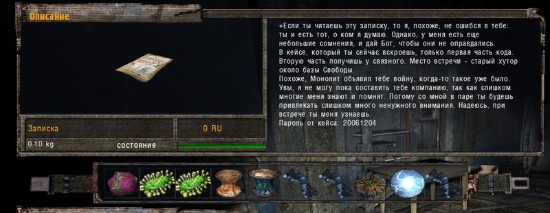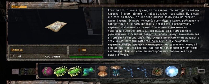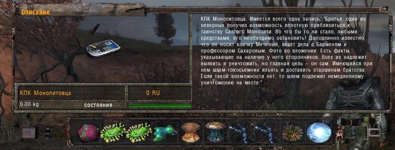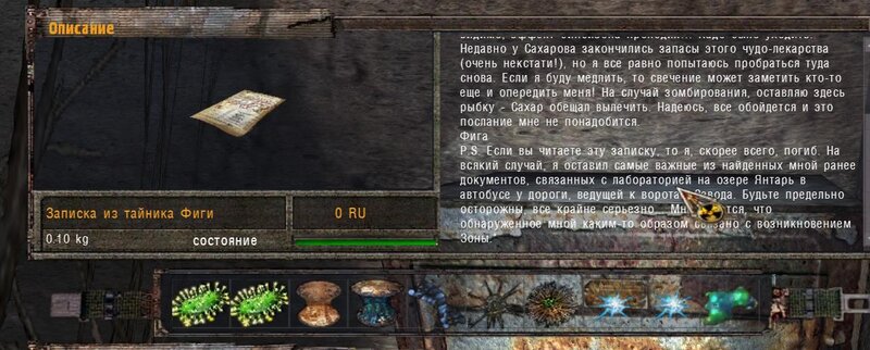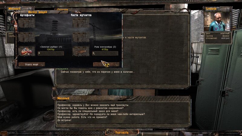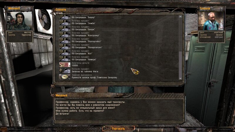 Za dokumenty Tompsona z sejfu Figi dostajemy kartridże do bioradaru z danymi o mutantach. Mamy tez na stanie instrument diagnostyczno-leczący i kartridże do niego. U Sacharowa można też wziąć zamówienie na artefakty i części mutantów.