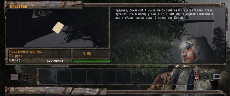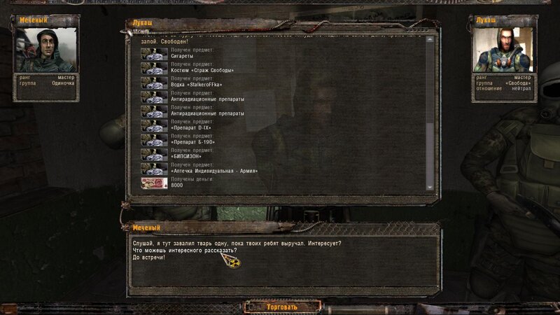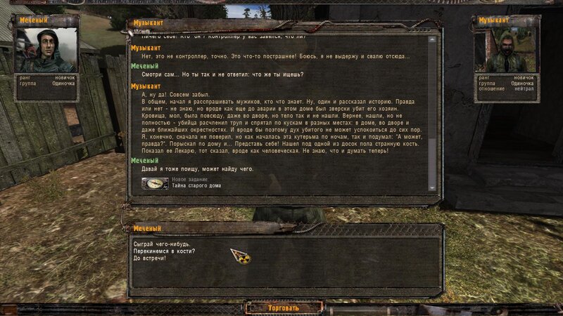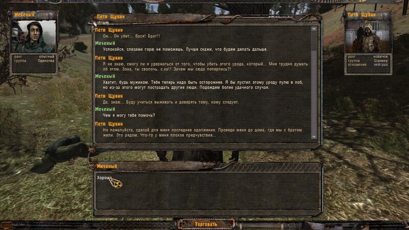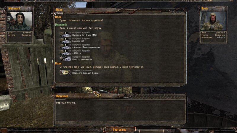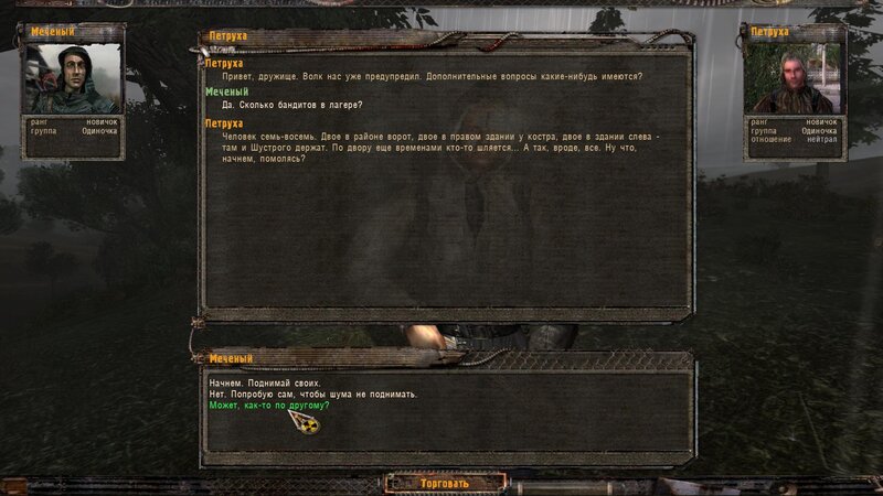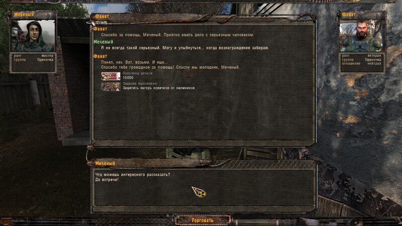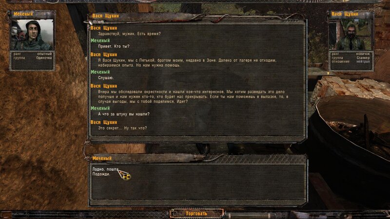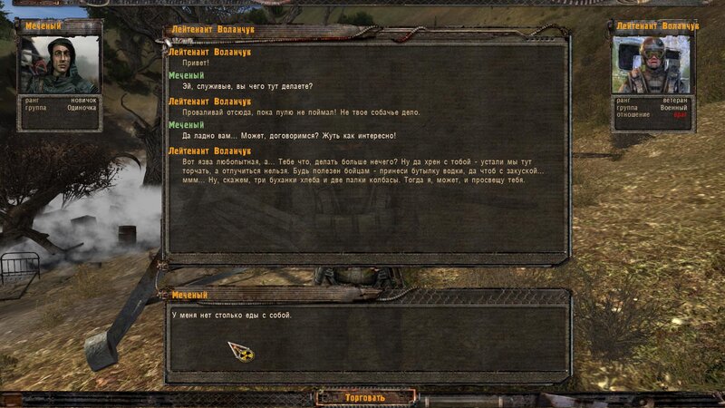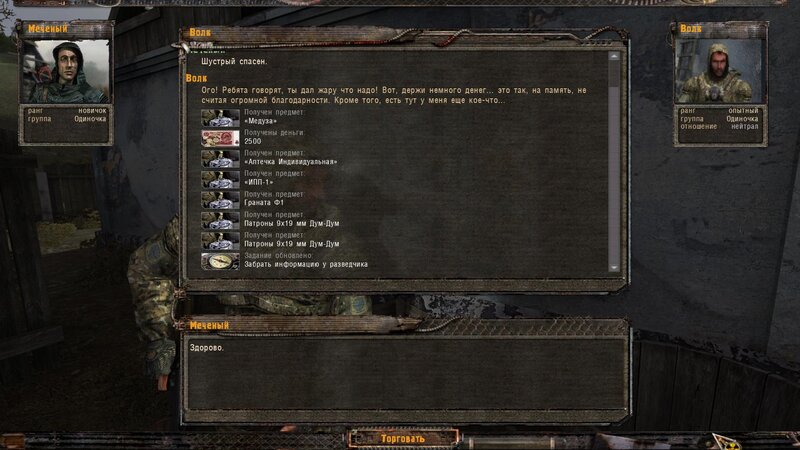 Rozliczyłem zadanie na Najemników - dostałem dobry karabinek oparty na Sajdze. Kupiłem też noktowizor. Kolejnym człowiekiem z którym pomówiłem jest Wasia Szukin - siedzi z bratem w chatce za wioską przy ognisku. Chce byśmy ich osłaniali - kiedy jesteśmy na miejscu pytamy czy to tu - stoimy przed lodówką. Jeden z towarzyszy dłubie przy drzwiach i następuje wybuch. Majstrujący ginie. Podchodzi do nas Troll - bandyta i przechwala się.