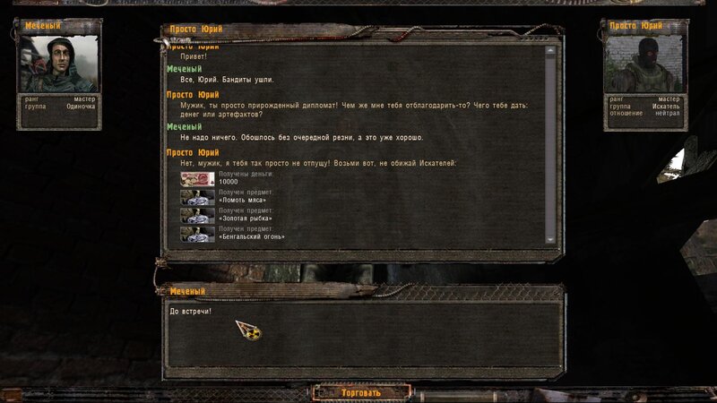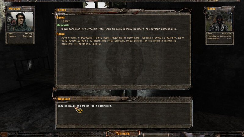 Dalej do Mrocznego Parowu. Tam pomówiłem z Jurijem - mamy wydostać z zakładnika informacje o położeniu schowka z notatka. W zamian negocjujemy jego wolność. Błocha mówi, że zgubił plecak - ponownie pomaga Czeburaszka - jest pod krzakiem nieopodal zabudowań. Odnajdujemy i czytamy - mamy odnaleźć Dziadka. Mówimy z Profesorem - szefem bandytów - wycofują się. Od Jury niczego nie chcemy - dostajemy tym większą nagrodę.
