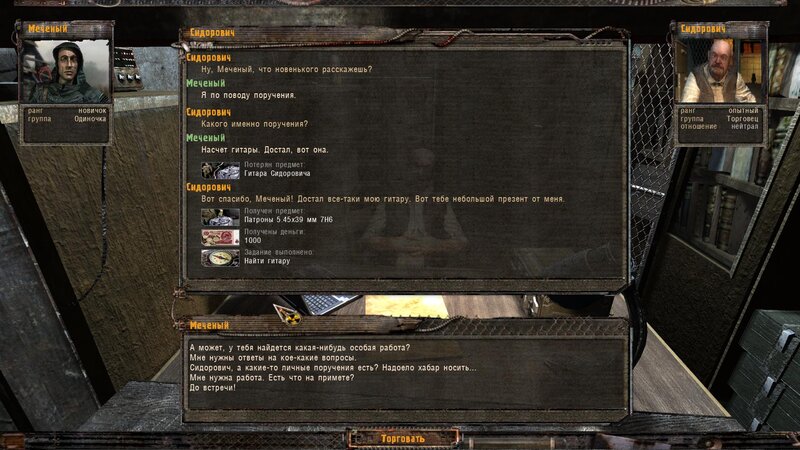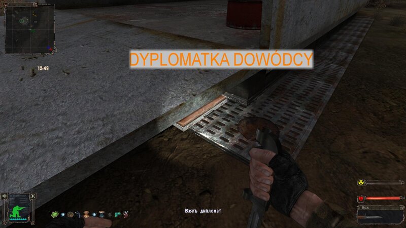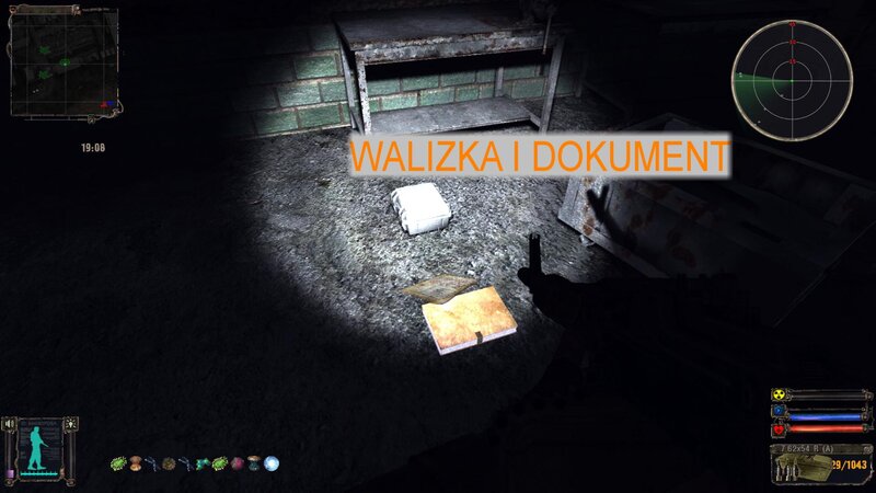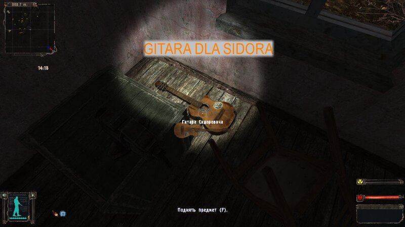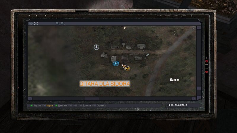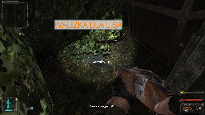 Przeszedłem przez tory i od Lisa dostałem zadanie na odnalezienie teczki za posterunkiem wojska. Włazimy przez siatkę i za bazą jest sterta płyt - tam jest walizka. Zanosimy ją dla Sidora - dostajemy 20 tys. Odnalazłem też gitarę - jest w domku z dziadkiem. Leży koło szafy.