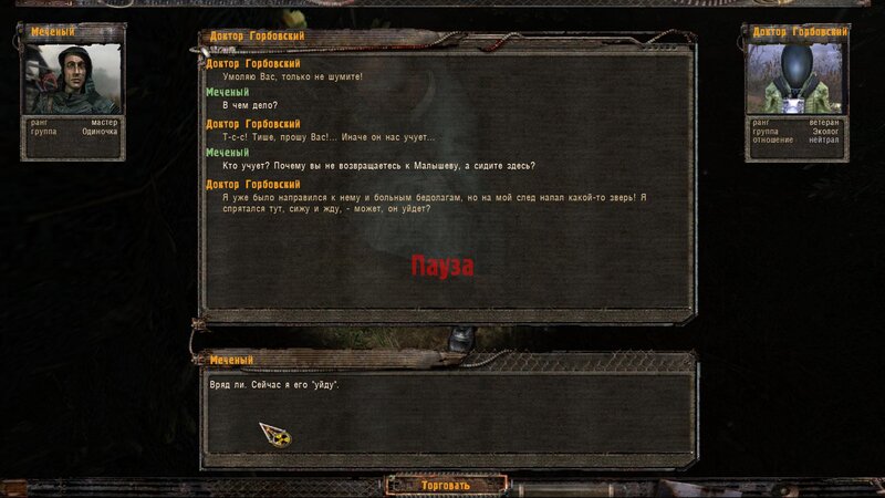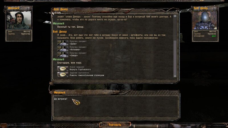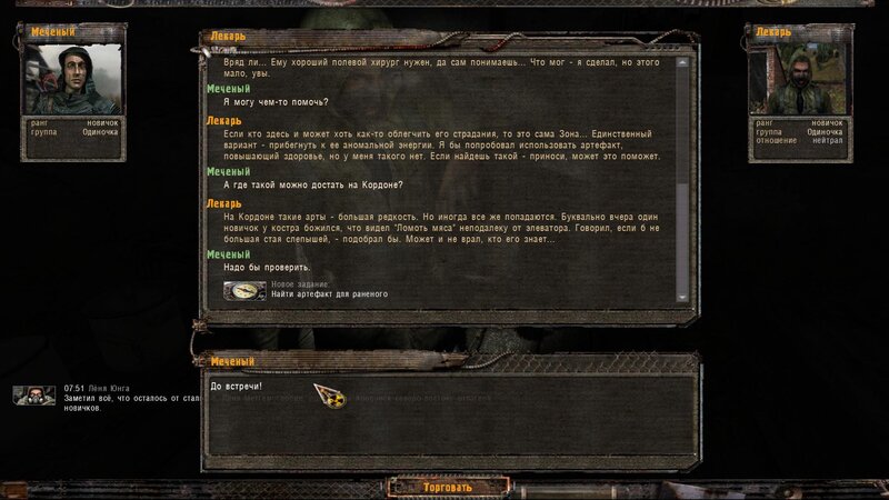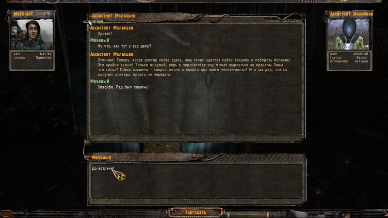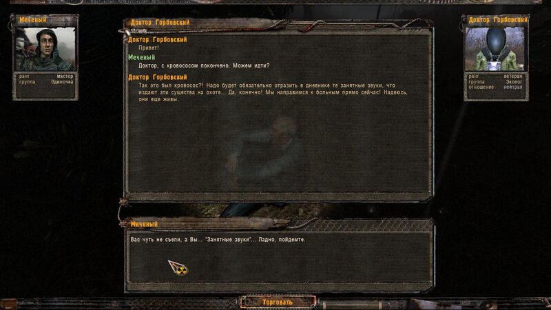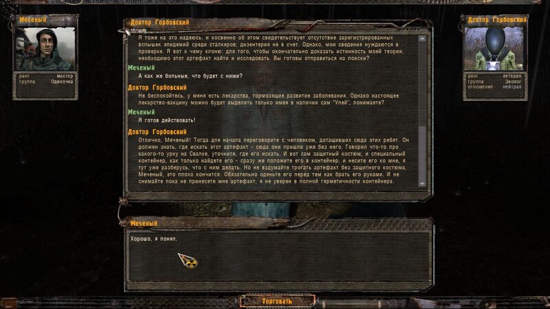 W Barze mówimy z doktorem Gorbowskim - ten boi się podejść do rannych - “coś” go obserwuje. Następuje atak pijawki - po tym idziemy do chorych. Mówimy z asystentem Malsziewem i ponownie z Gorbowskim - podleczył kolegów ale do pełnego wyleczenia potrzebny mu artefakt od którego złapali infekcję - taki znajdziemy w Dolinie Mroku - dostajemy specjalny kombinezon i skrzynię na artefakt. Ruszamy.