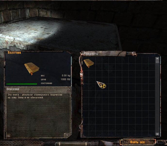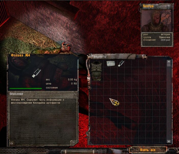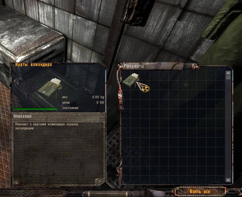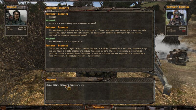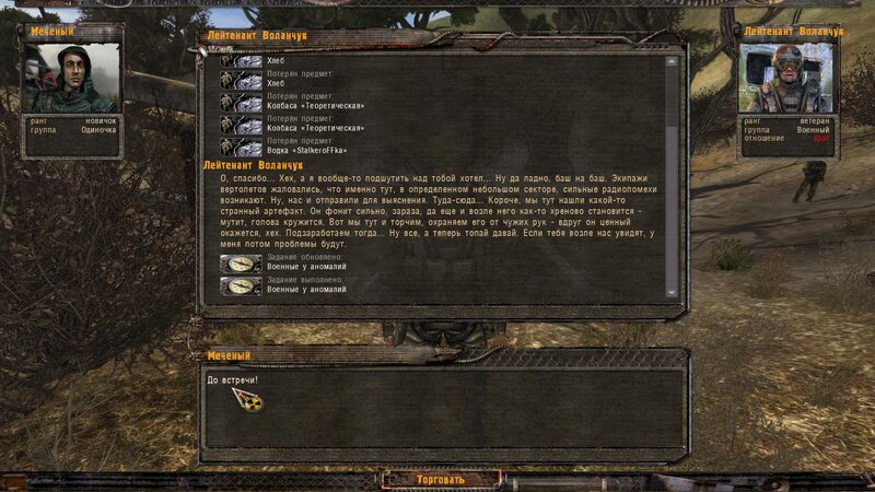 Kolejne zadanie specjalne od Sidora to dowiedzieć się czego szuka wojsko w kotlince z anomaliami. Nie wolno nam strzelać. Wojak za informację chce butelkę wódki, trzy chleby i dwie kiełbasy. Po dostarczeniu prowiantu dowiadujemy się, że śmigłowiec wypatrzył podwyższone promieniowanie - to jakiś artefakt tak działa. Sidor chce byśmy pod płaszczykiem pomocy odnaleźli cudo i przynieśli dla niego. Mówimy z wojskowym i szukamy. Art jest w starej kabinie.