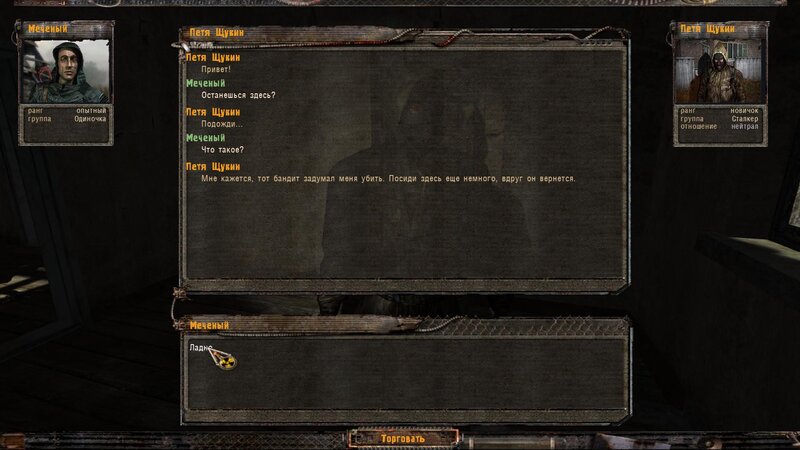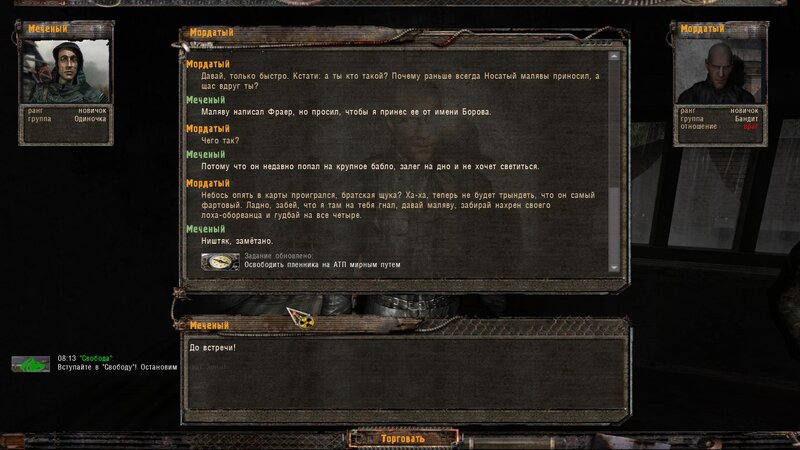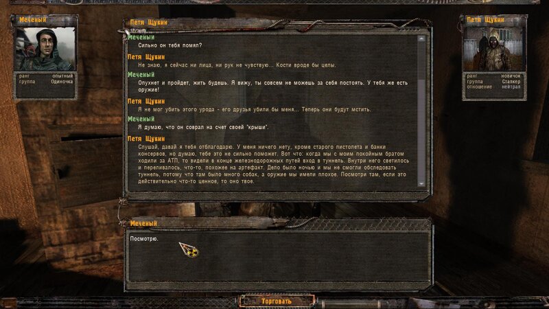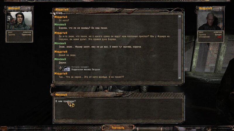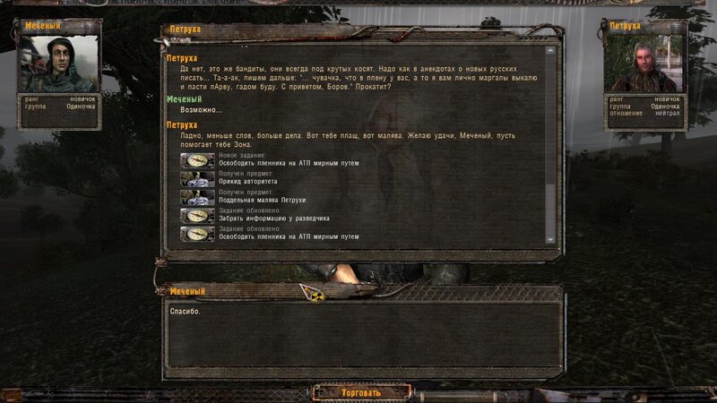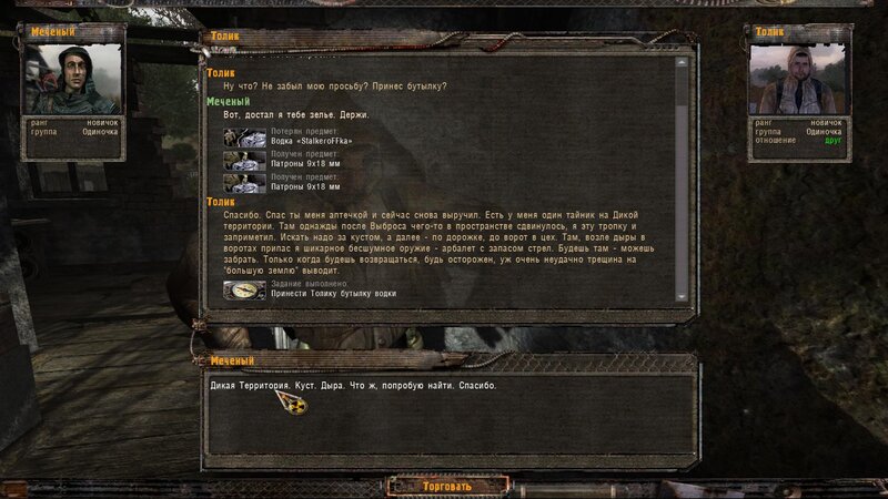 Pogadałem z Tolikiem - chce byśmy mu przynieśli butelkę wódki. Obok w ziemiance siedzi Lekar - temu by wyleczyć chorego potrzebny jest artefakt Kotlet. Dalej pogadałem z Wołkiem i poszedłem do Pietruchy - u niego mamy nowy dialog na pokojowe zakończenie z bandytami na ATP - mamy wziąć list rzekomo od Borowa i włożyć Płaszcz Autorytetu - bandycki kostium.