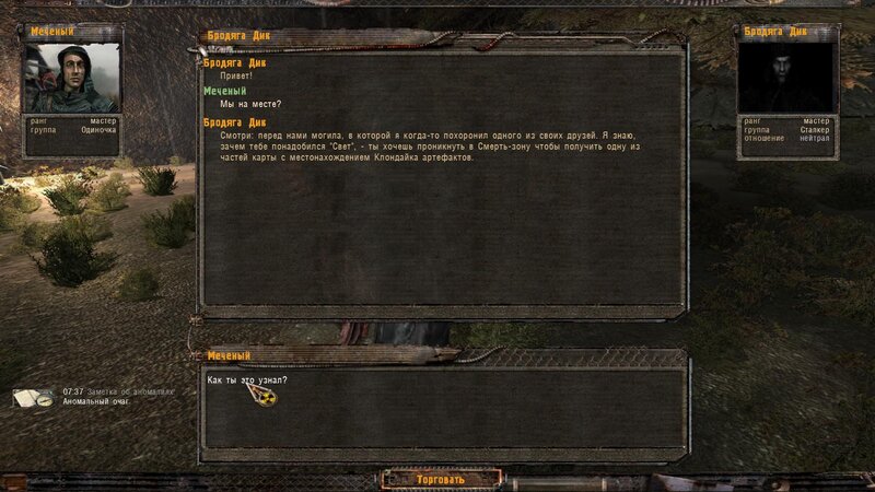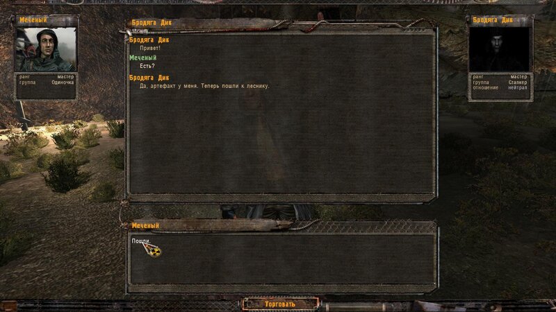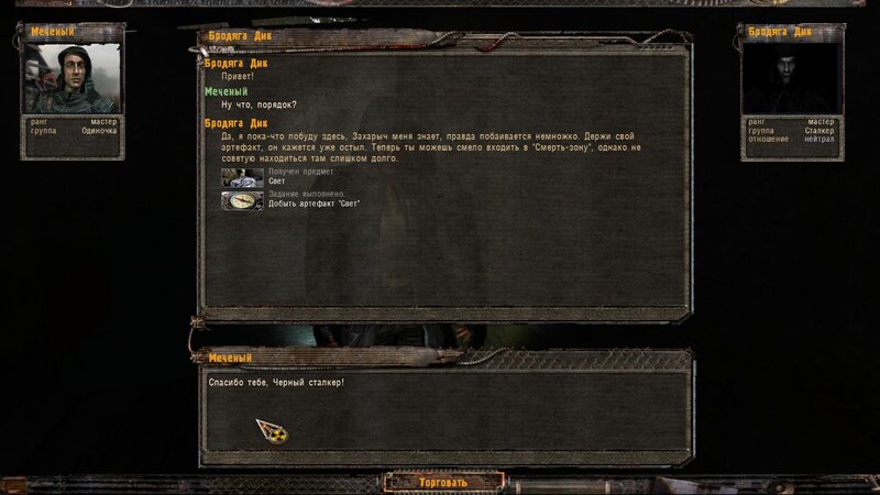 Mówimy z Bradziagą Dikiem. Jest niewidomy ale ma psa przewodnika. Ten ma nas doprowadzić do grobu Czarnego w którym jest artefakt. Po drodze potykamy się z napastnikami i mutantami. Na miejscu Włóczęga sam wchodzi w anomalię i wychodzi z artem. Ruszamy do Dziadka. Tam dostajemy art. Przychodzi SMS, że się jeszcze spotkamy.